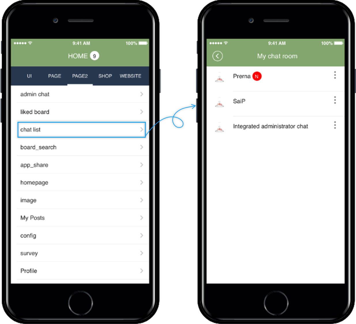 After the update, you can see the [Chat list] is added in the page menu- swing2app page.