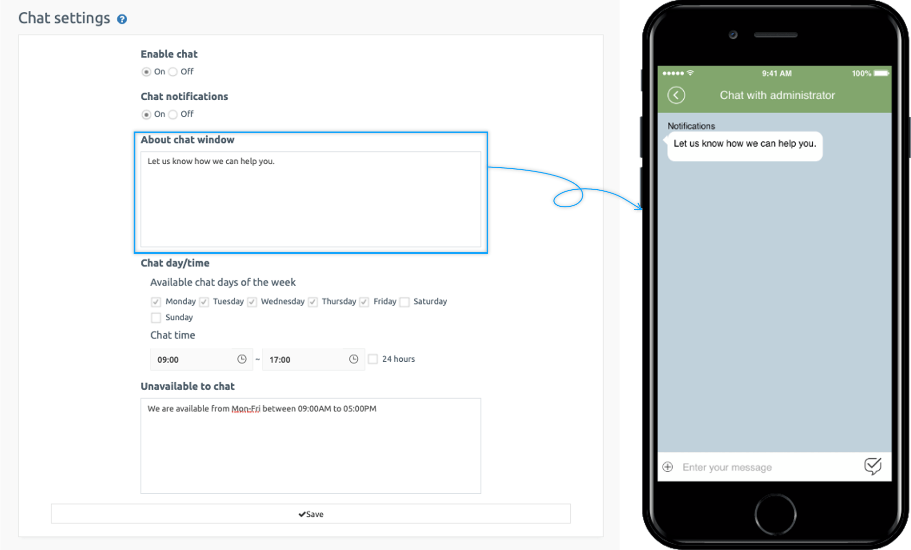 Set the chat introduction message, available day/time of chat, and non-chat message.