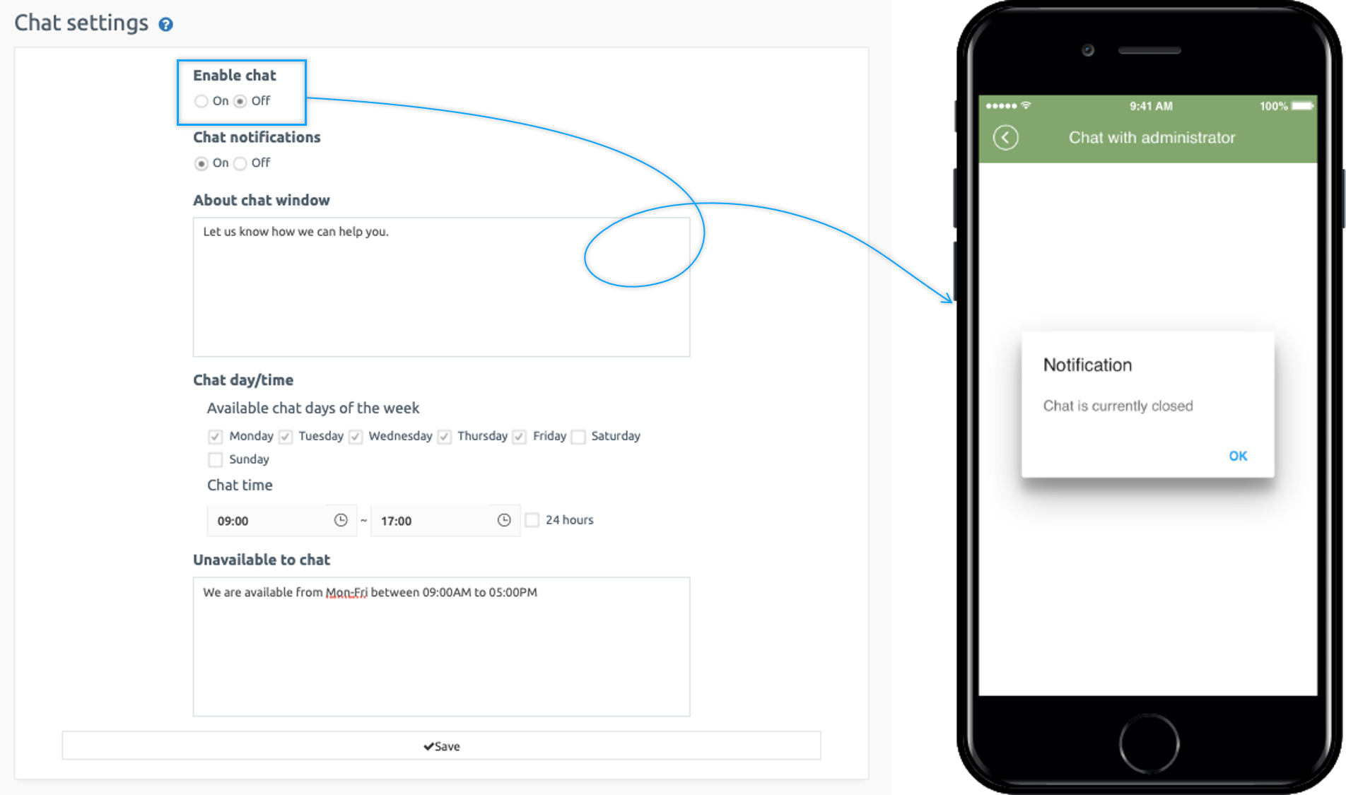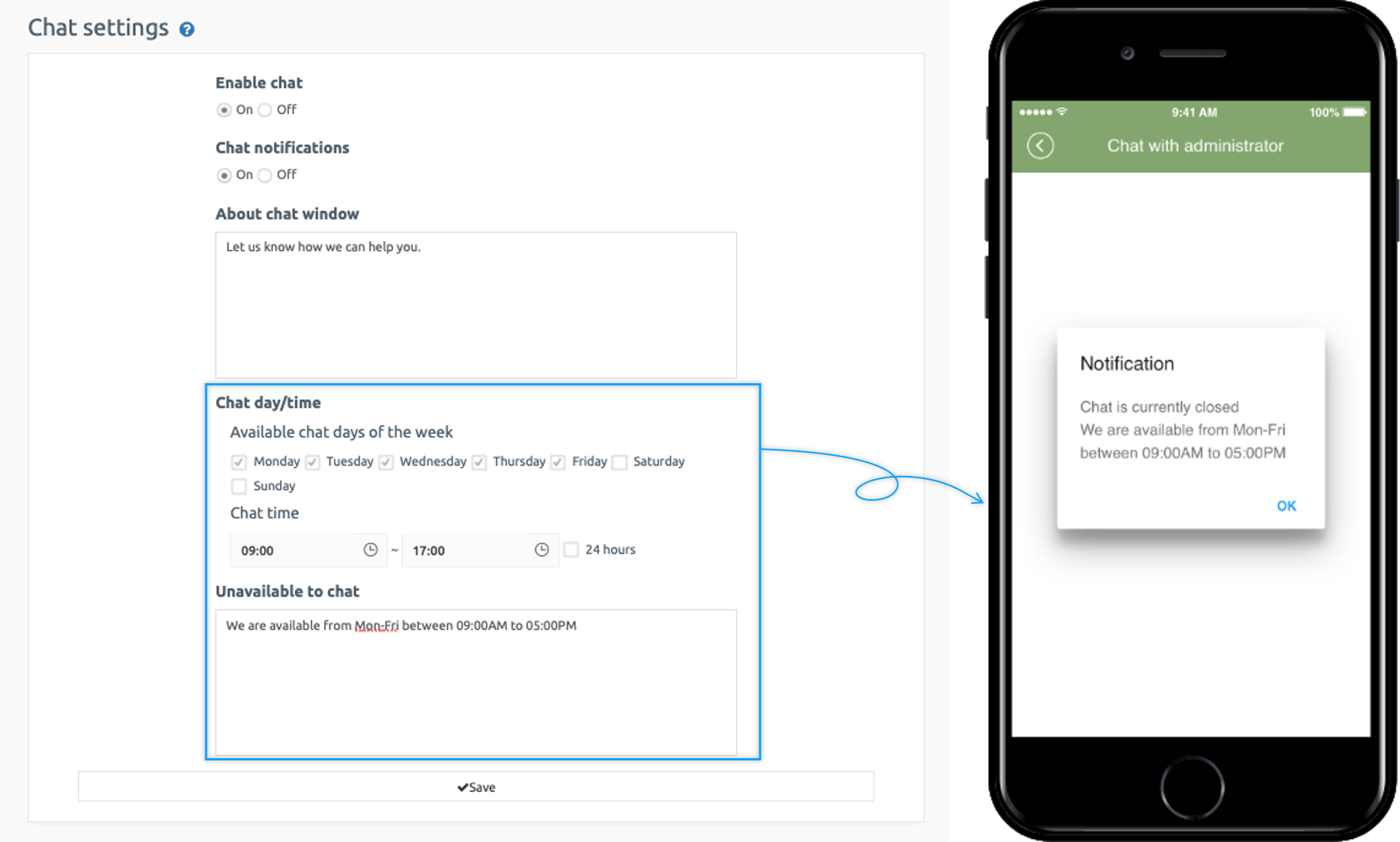 Set the day and time of the week when you will not be available to chat. When you set a message, it will pop up as soon as you open the chat room on the app.