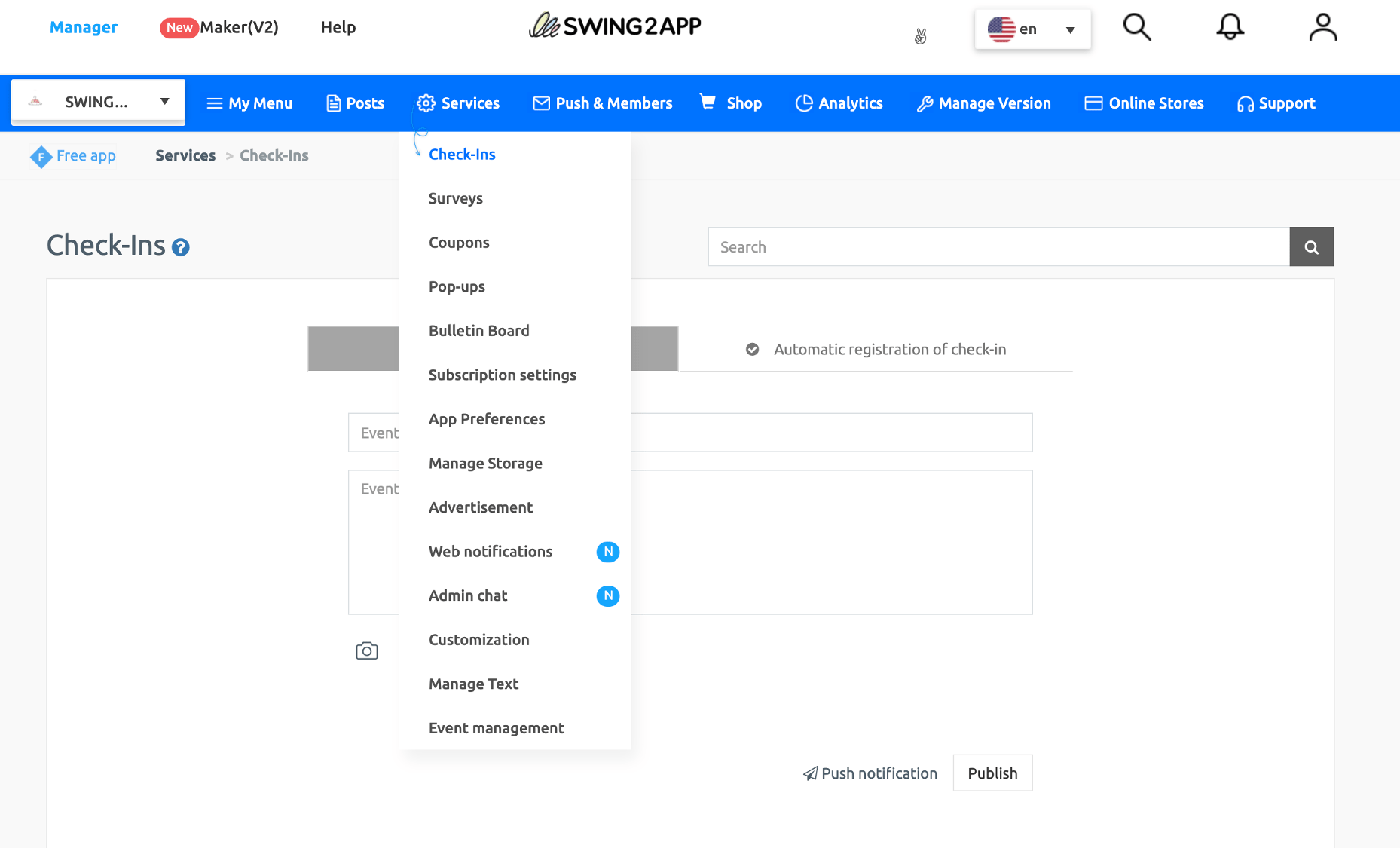 *Push Notification: When you want to notify app members of the check-in event, you can send push notifications by clicking the ‘Push Notification’ button.