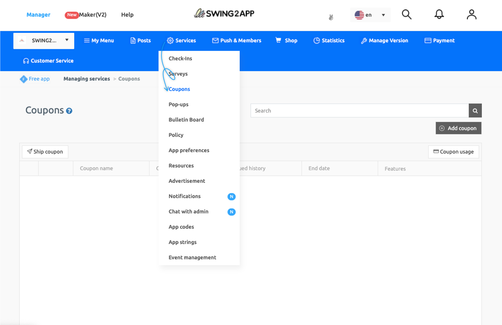 Manager → Services → Coupons → Enter the coupon details to be issued by selecting the Add Coupon.