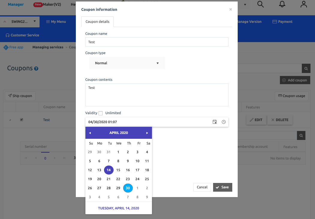 Select the validity of the coupon either by selecting the date and time or checking Unlimited.