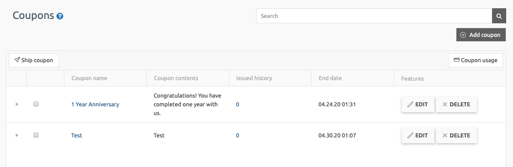 Users can check the issued coupon history, so the user can manage all the coupons created.