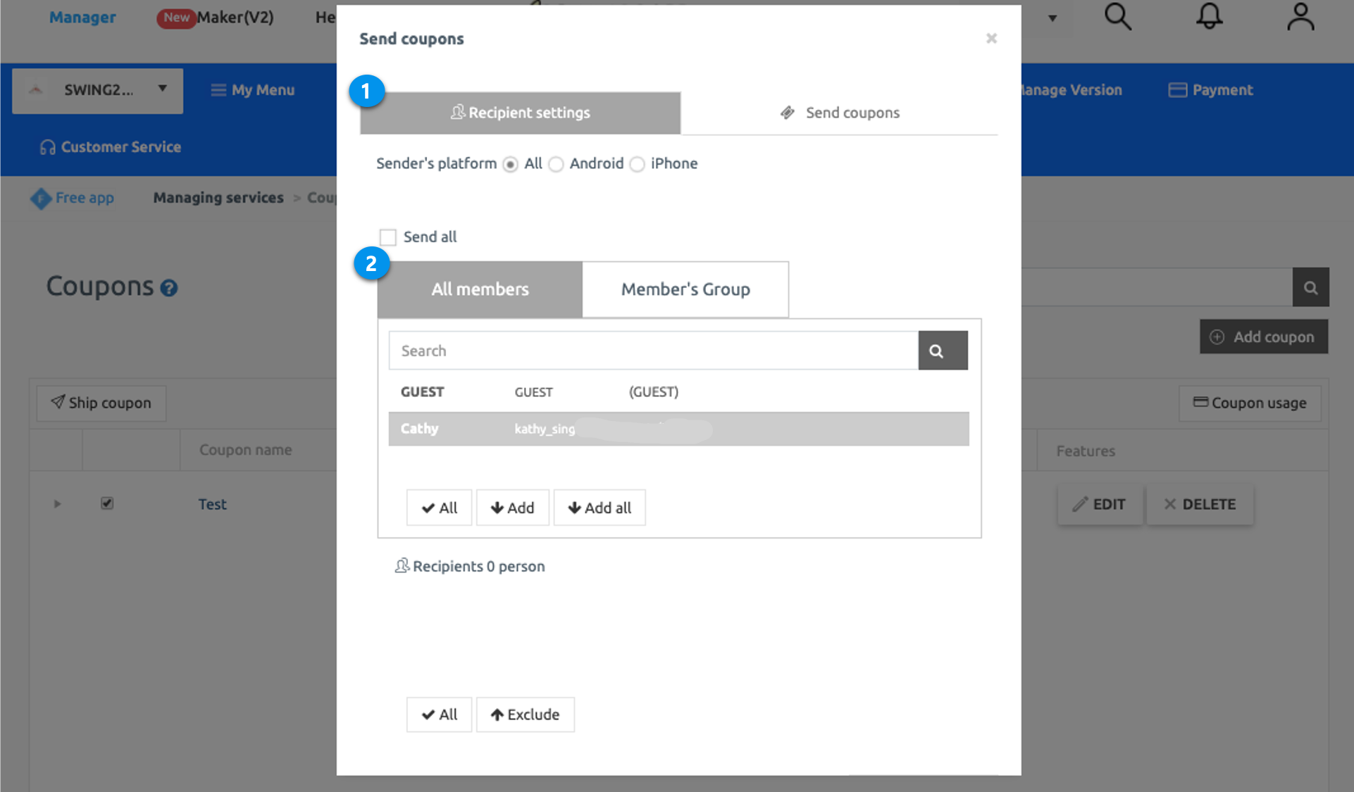 From the Coupon Management page → Click the Ship Coupon → First, select Recipient Settings → Second, select the member you want to send the push notification → Third, select Send Coupon → Fourth, fill in the details for push message → Fifth, click Send