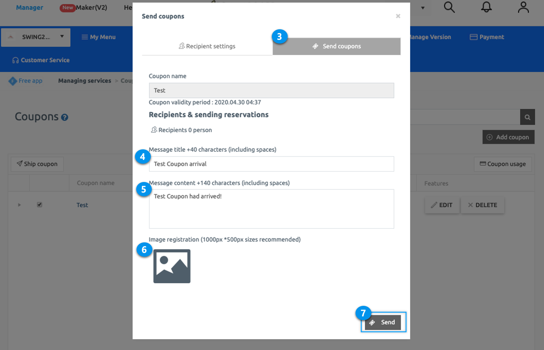 3. Select Send Coupon. 4. Write Message Title. 5. Write a message to be sent in push message. (Push message title and content are fixedly provided. You can send it as it is, or you can edit and enter it.) 6. Upload image for the push message.(image size 1000px*500px) (Image registration is not mandatory. Since the push image is not visible on the iPhone, iPhone users will not be able to see it even if you attached the image.) 7. Click Send.