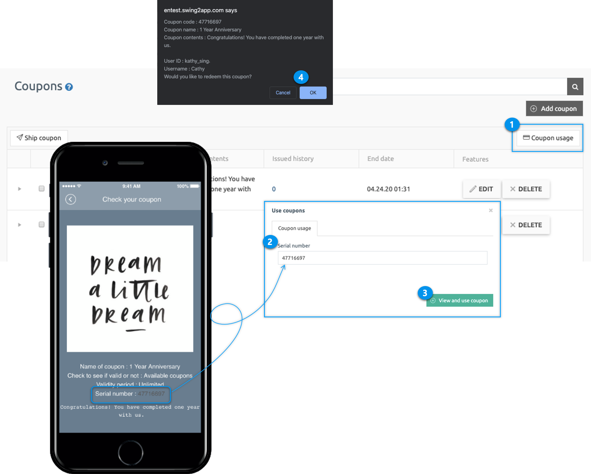 On the Coupon Management page, click Coupon Usage → Enter Coupon Serial Number → Click View and Use Coupon