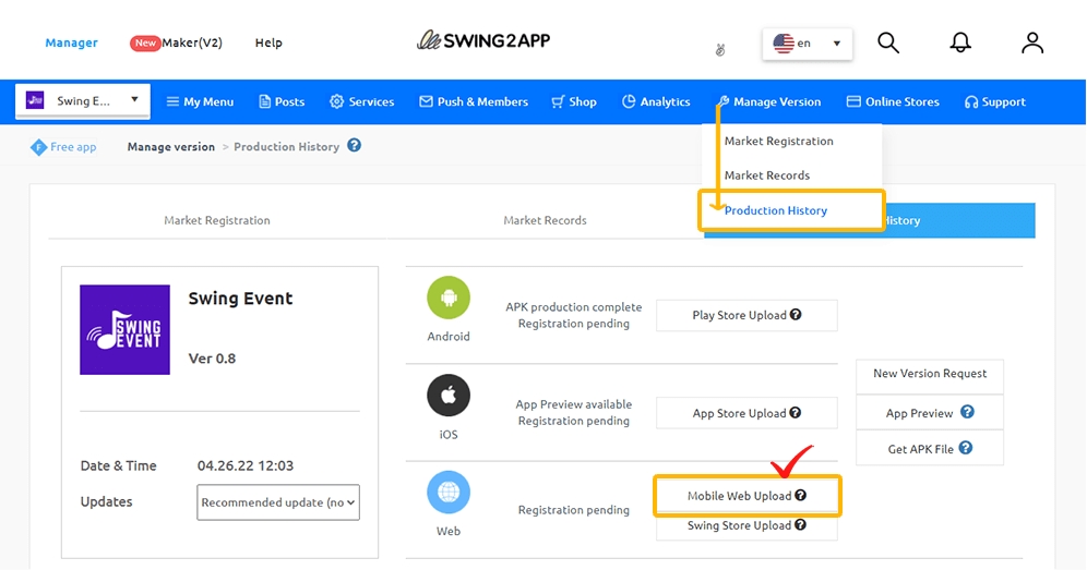 → Fill out the application form by selecting the [Apply for mobile web upload] button on the App operation-version management-app production history