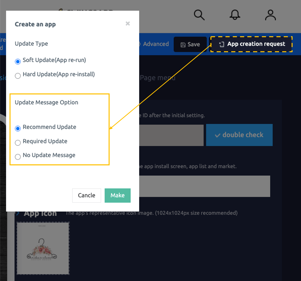 3. Step 1 of the app creation phase [app basic information]-Change the app name, standby screen image, icon image →Please re-create it by pressing the [App Creation Request] button. Please select Hard Update!** → Users who have released apps on the Play Store, App Store, etc. must update the new version of the APK file to the store again after the app is created.**