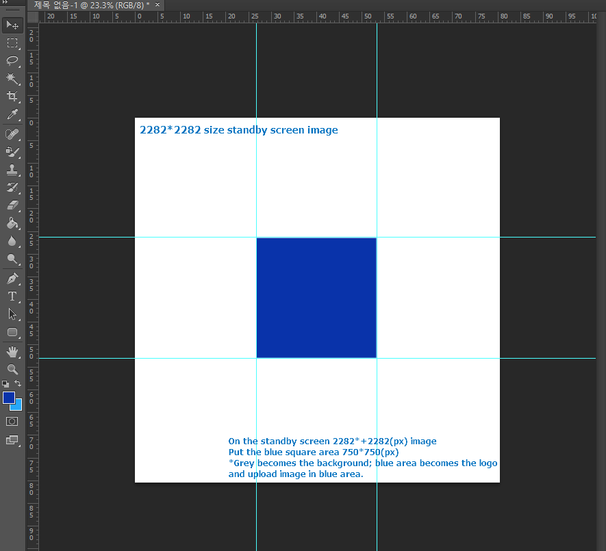 1. Please first create a square image of 2282 * 2282 size idle screen. 2. Use the grid line to give a total of 9 equals. (You don’t have to pay for grids, but you need to be more accurate in your image work.) 3. Center the square area of 750*750 px. = A color has been added to the area to make it easier to understand. ( Let’s create it by adding color and once the image is finished, you can subtract the color.) * The grey part is the part of the background that covers the entire area of the image. * And the image shown on the phone is the blue area. Create an image by putting the image or logo of the company you want to make into the blue area. * Only work inside the blue area.