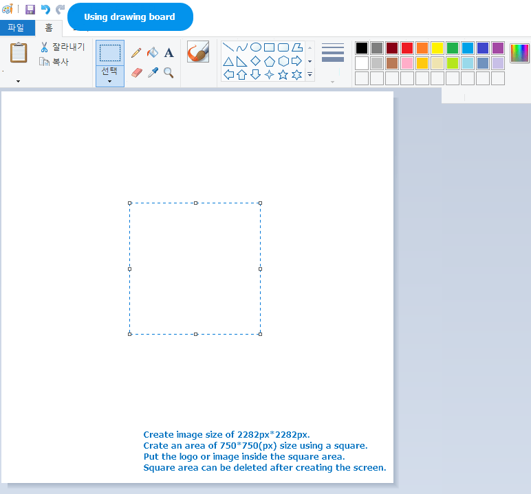 1. Launch Paint, and then create an image of size 2282 * 2282 from the [Resize] menu at the top. 2. And select the [rectangular shape] tool tip and make it 750*750 size in the center. (It’s not 750 size, it’s 749, but the error is fine) 3. You can then create an image inside the area just like you saw in Photoshop. 4. After creating, delete the rectangular area.