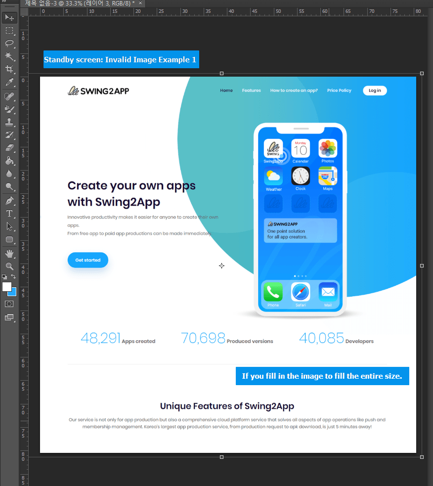 When you create an idle screen image, you do not create a center image area, as in the method above. If you fill an image with a full background size, it will be cut off or vertically distorted when running the mobile phone app! Never create an image that fills your screen!!