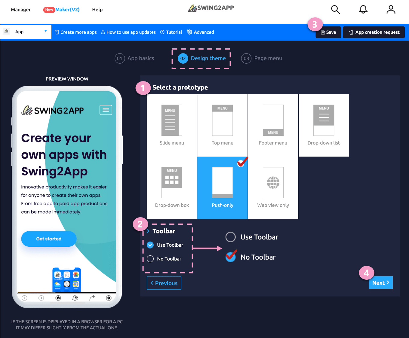 *If you select to remove the push toolbar and create an app, a push app is created without a toolbar.