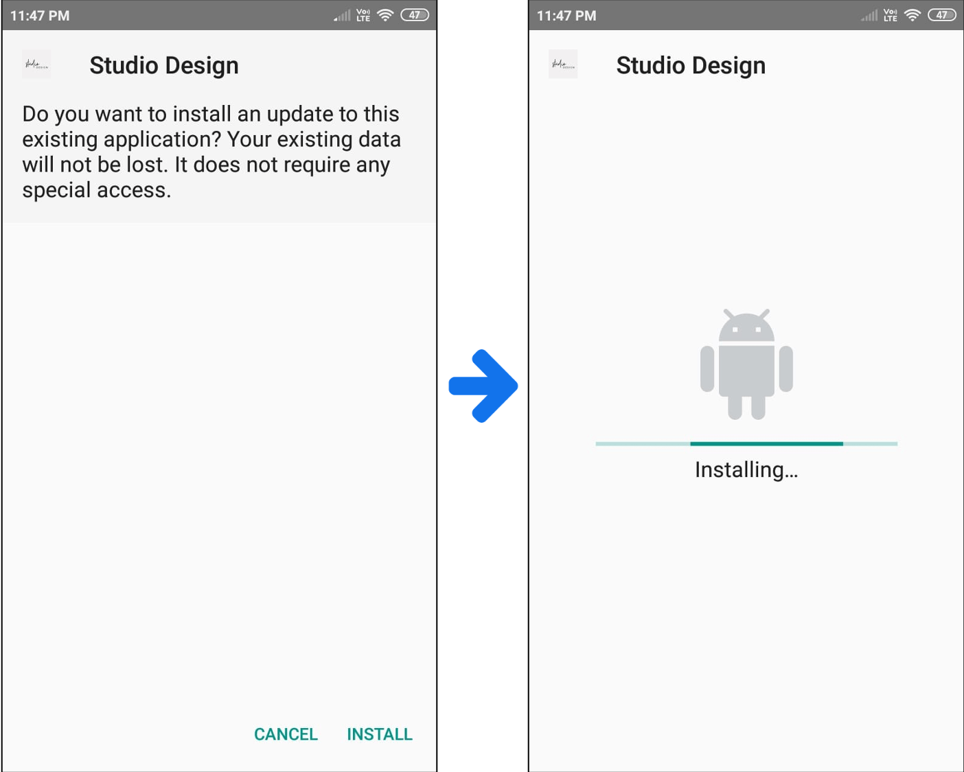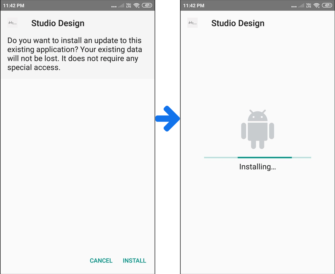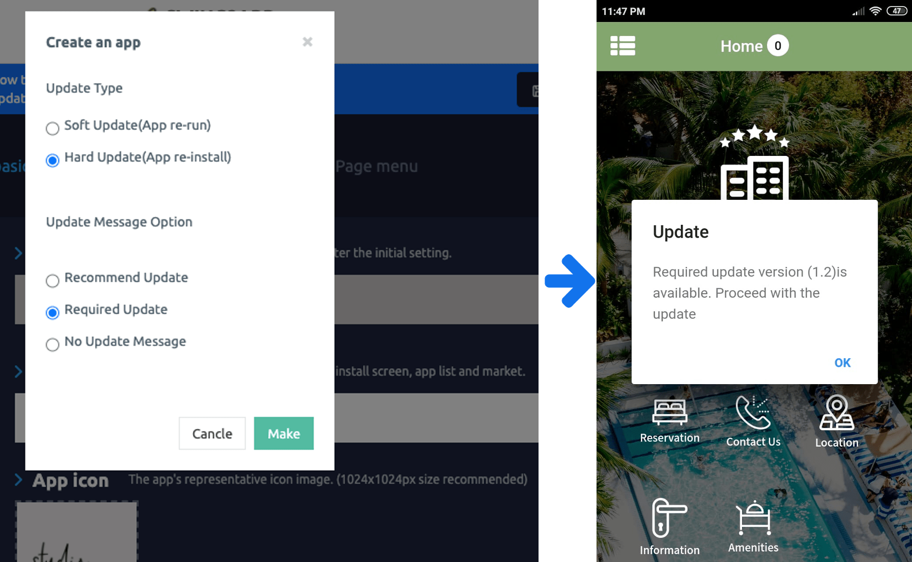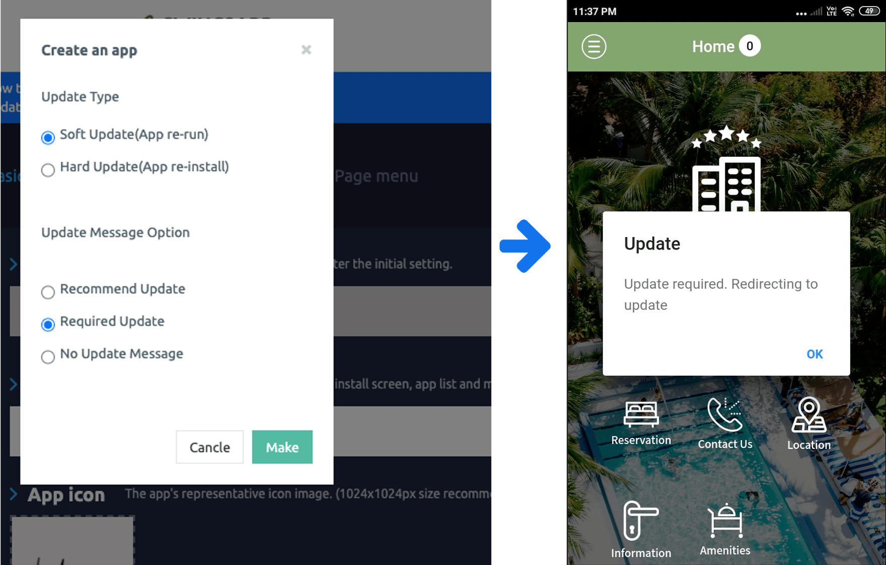 In case of a hard update, unlike the software, you will go to your device and reinstall a new version of the app. It will install the update of the existing application and will overwrite it with the new version of the app.