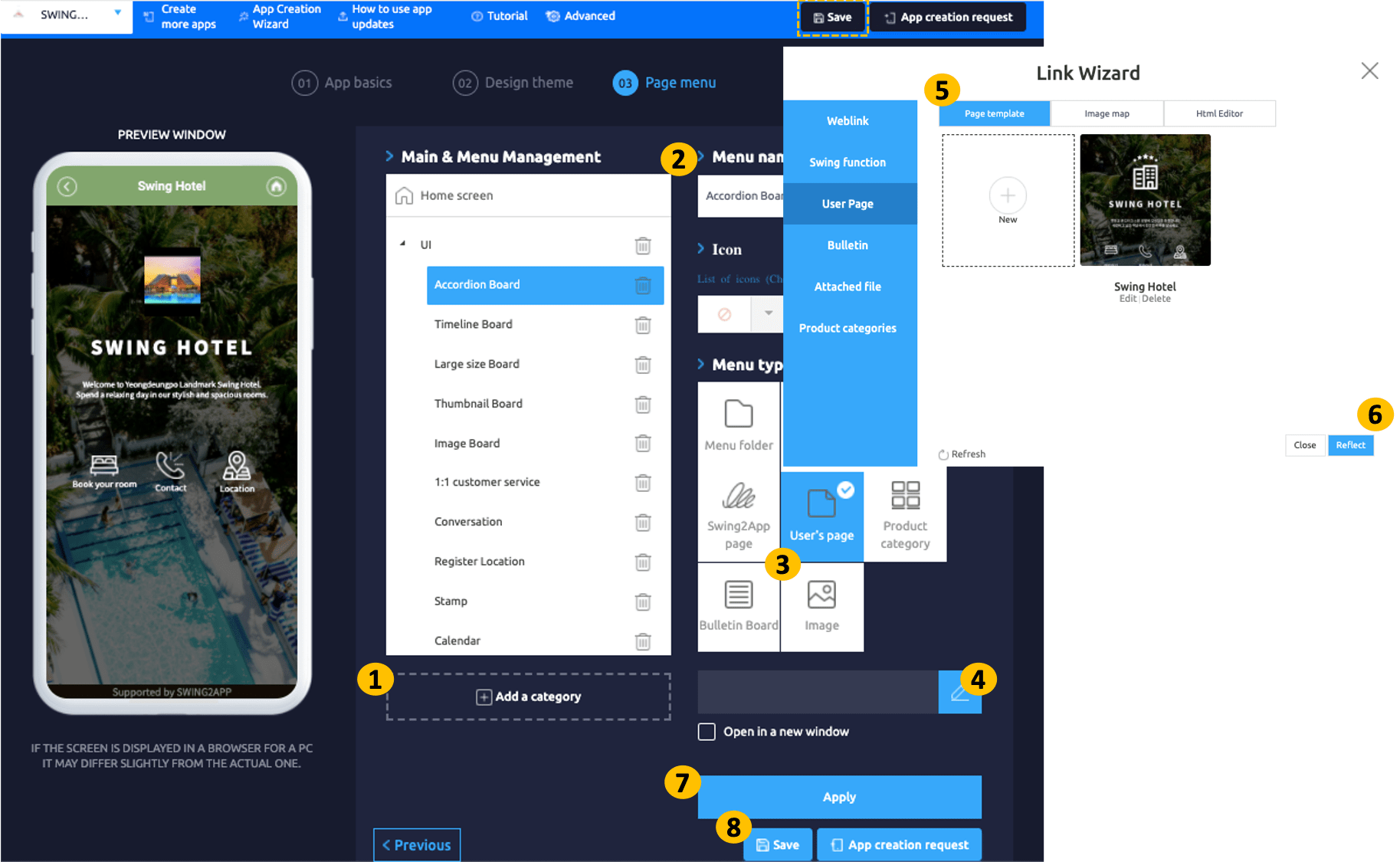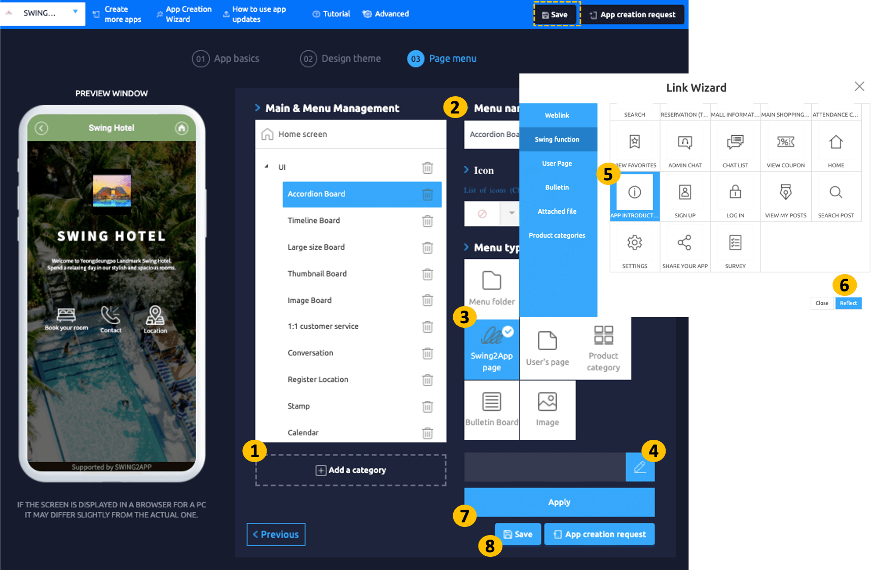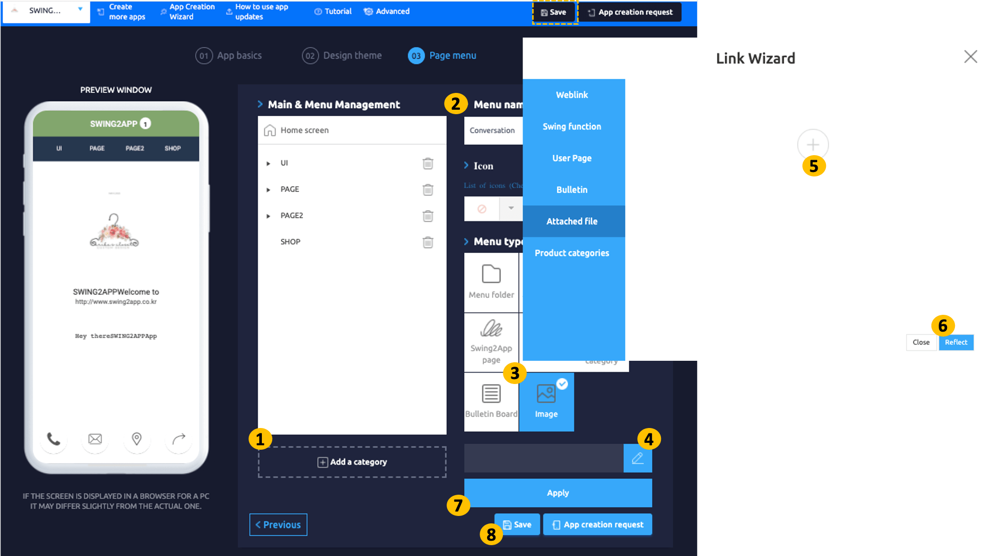 Swing2App home screen production can be applied from the Swing2App Maker(V2) page → page menu → Main & Menu Management → Home screen.