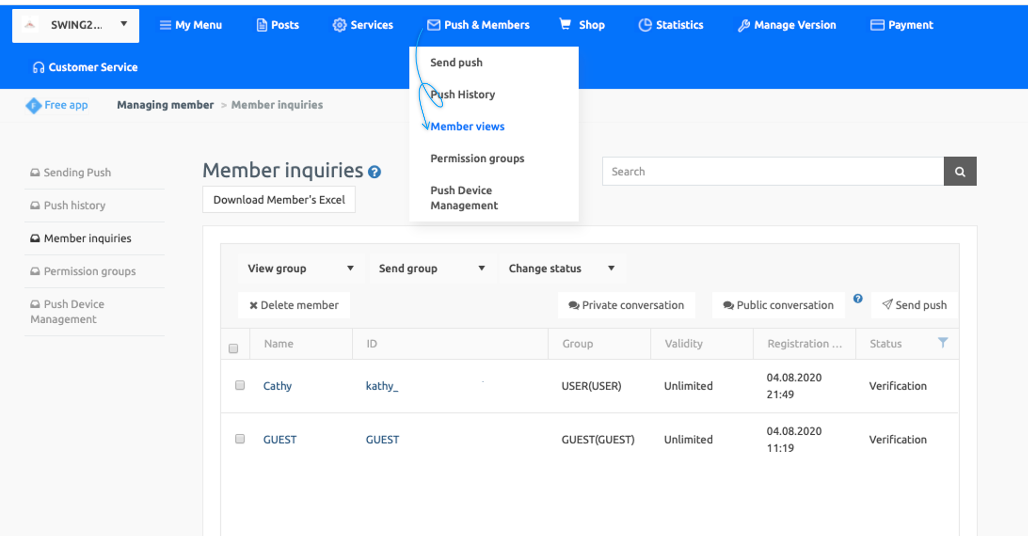 Move to the swing2app homepage app operation page → push & membership → member inquiry menu.