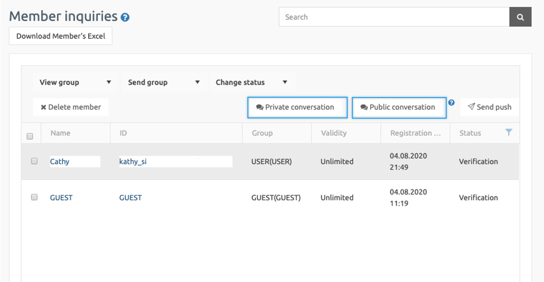 You can check the [Private Conversations], [Public Conversations]** buttons on the Member’s Inquiry page.**