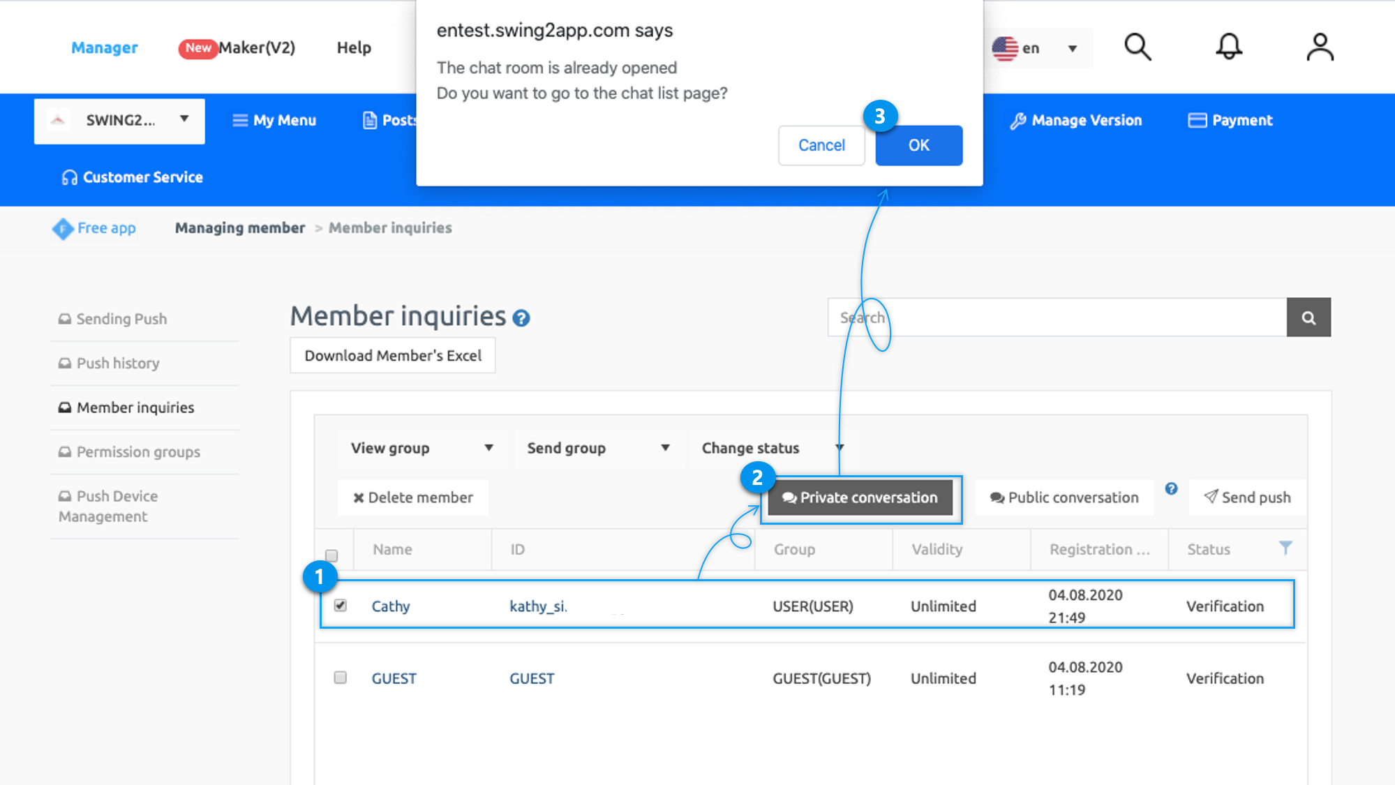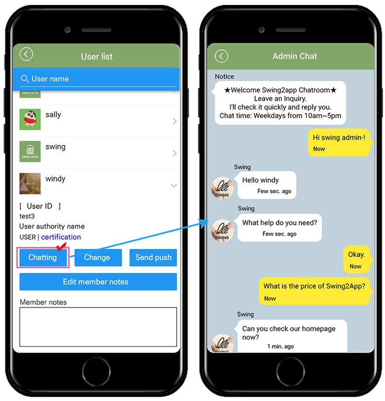 Administrators can chat by selecting members from the member inquiry menu provided on the Swing2App web(app operation page).