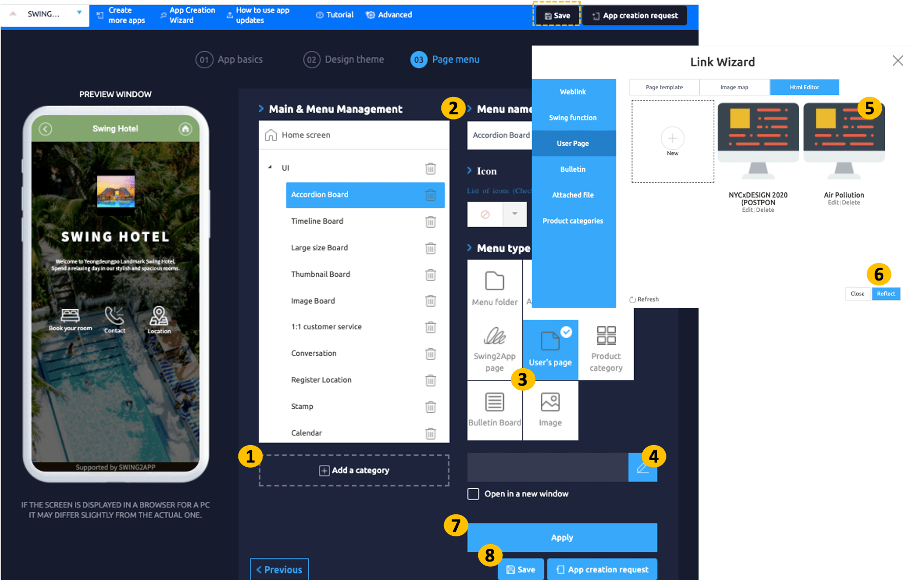 One of the functions provided by the user page of the swing2app operation page is a menu that allows users to create their own web pages.
