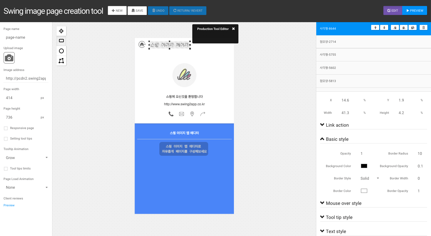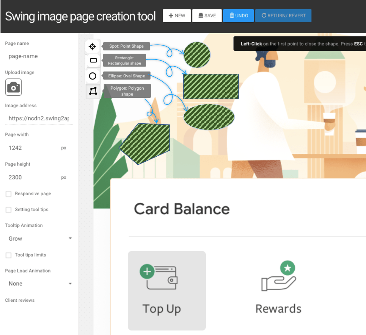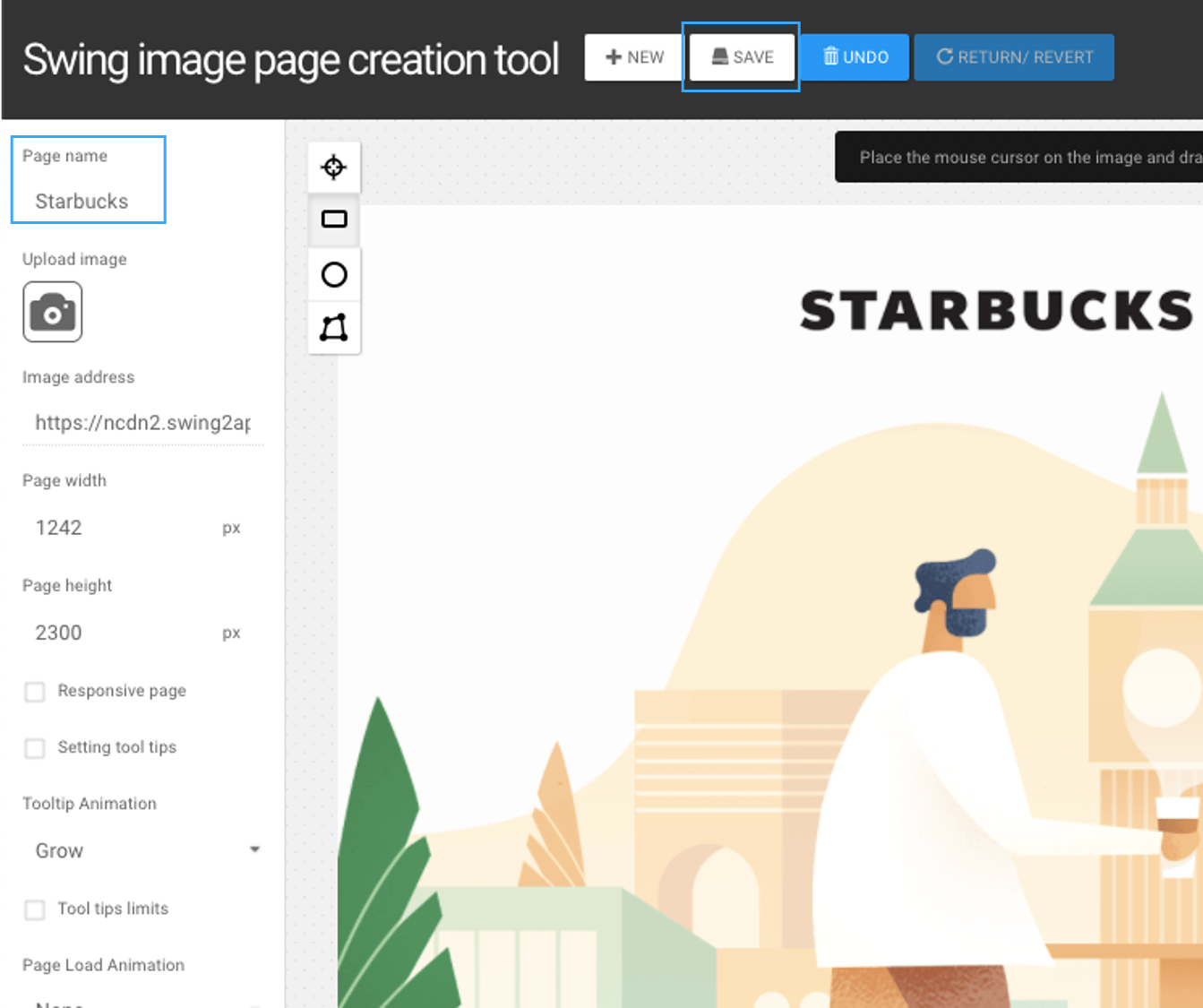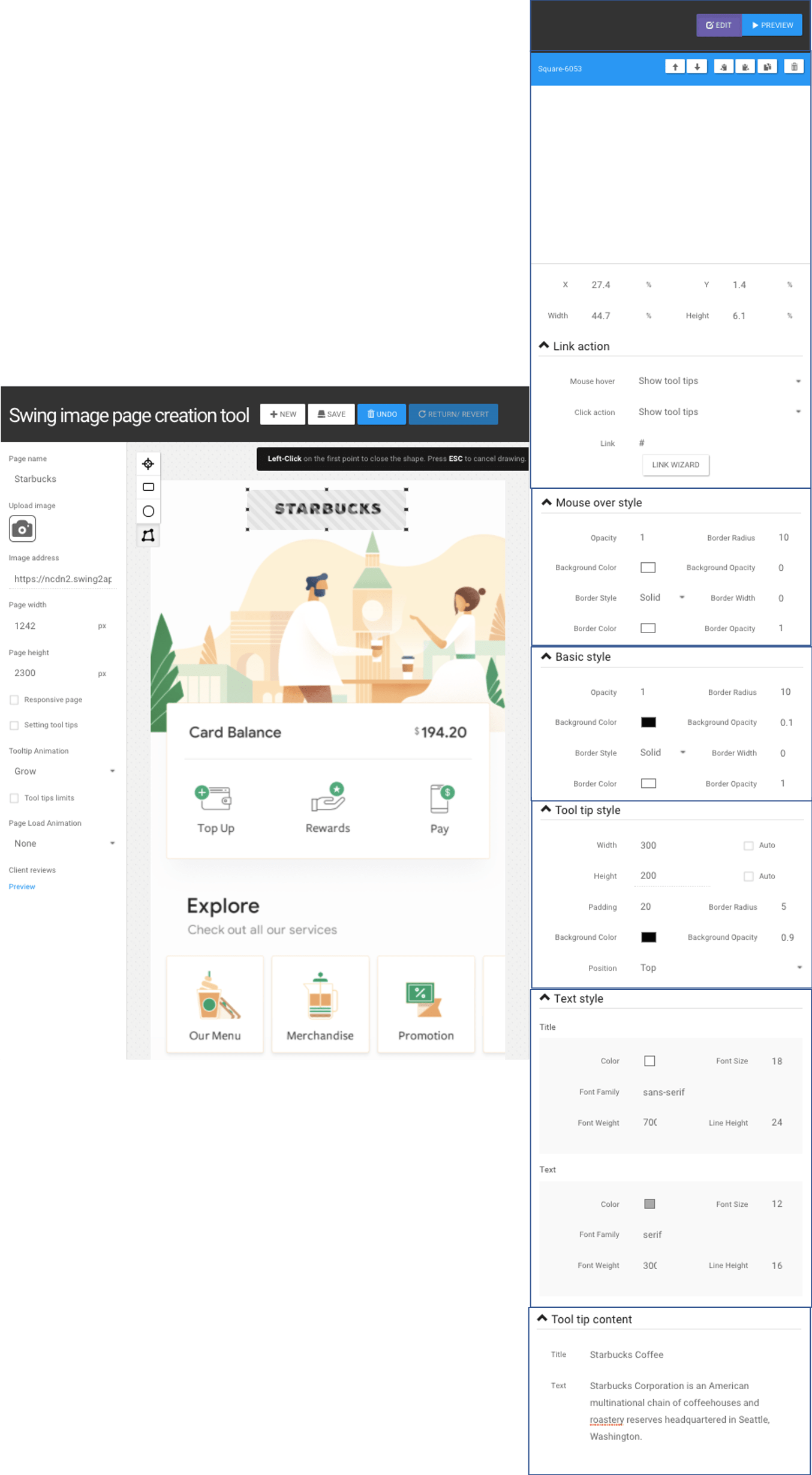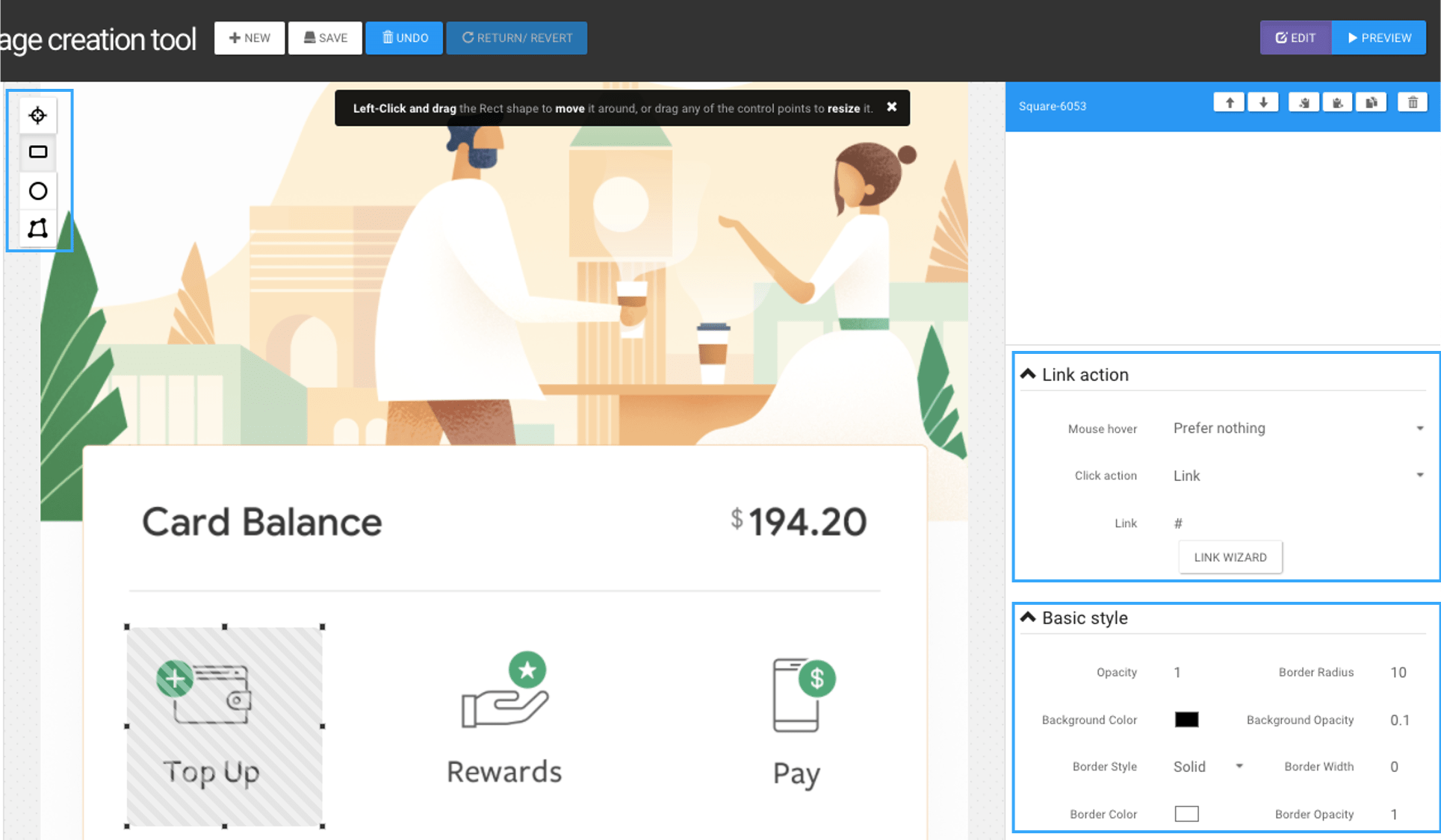 Just check the “Shape Tool” to set the banner area on the image, the “Link action” to link to the area, and the “Default style” to set the area style.