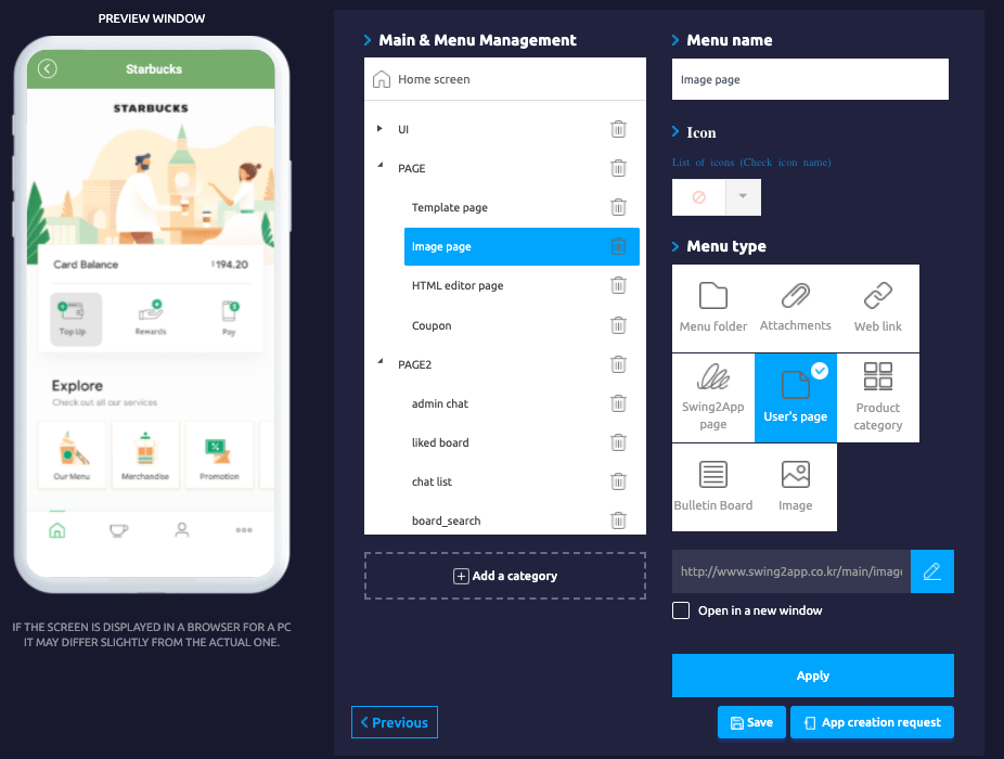 Finally, enter the page name. (When the app is applied, it is displayed in the menu with the page name).