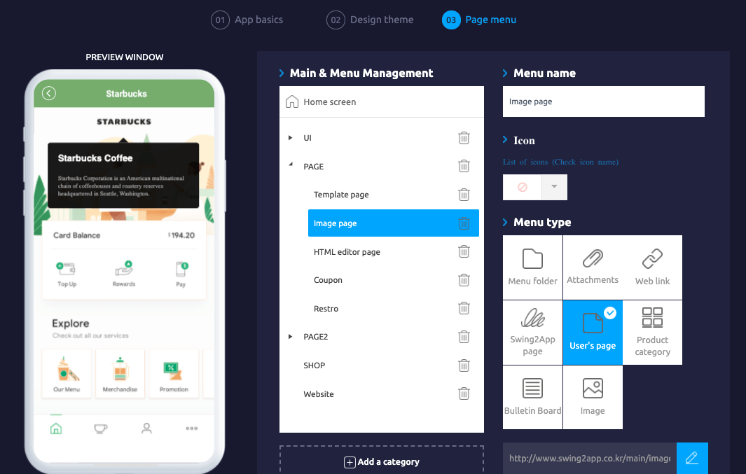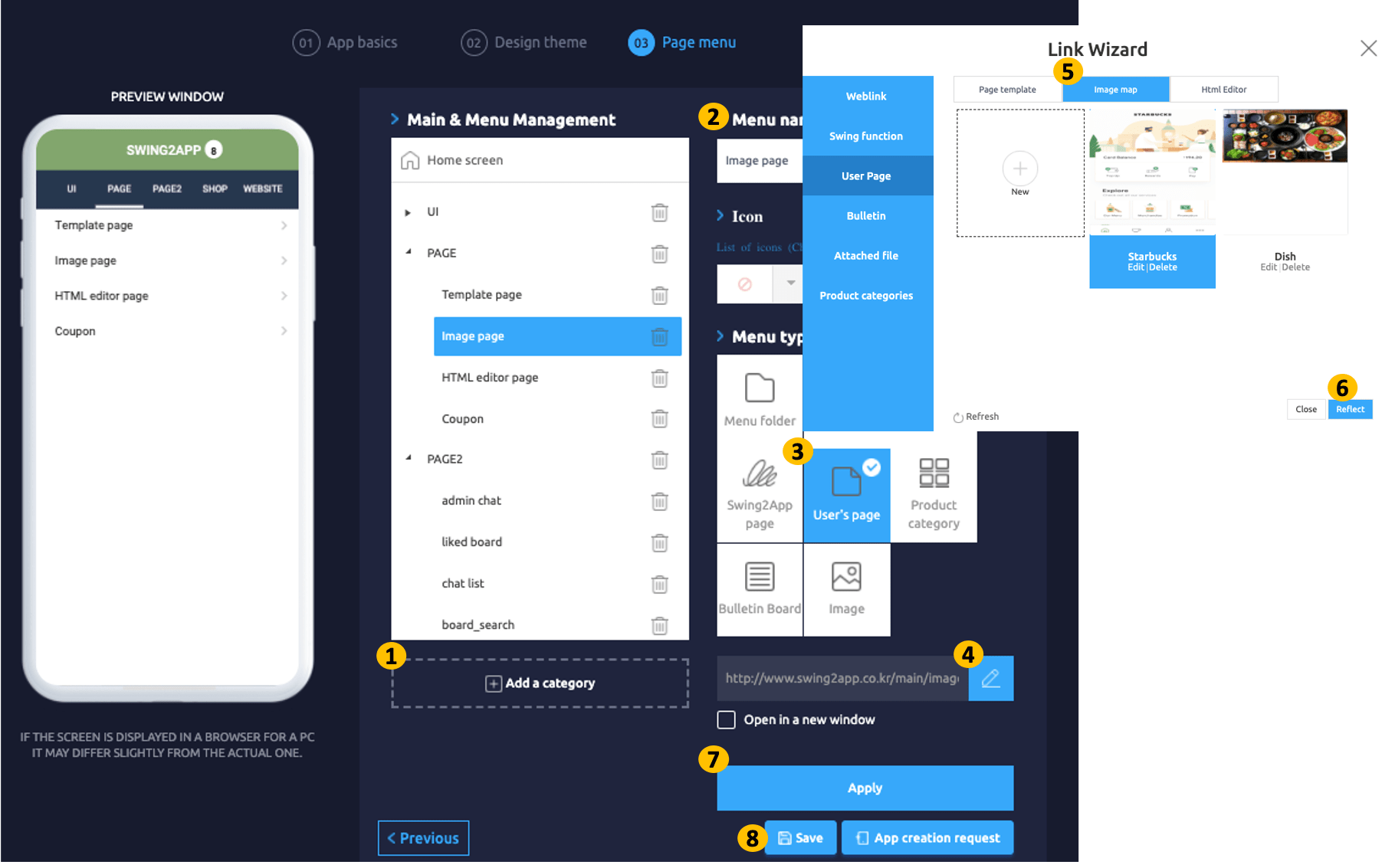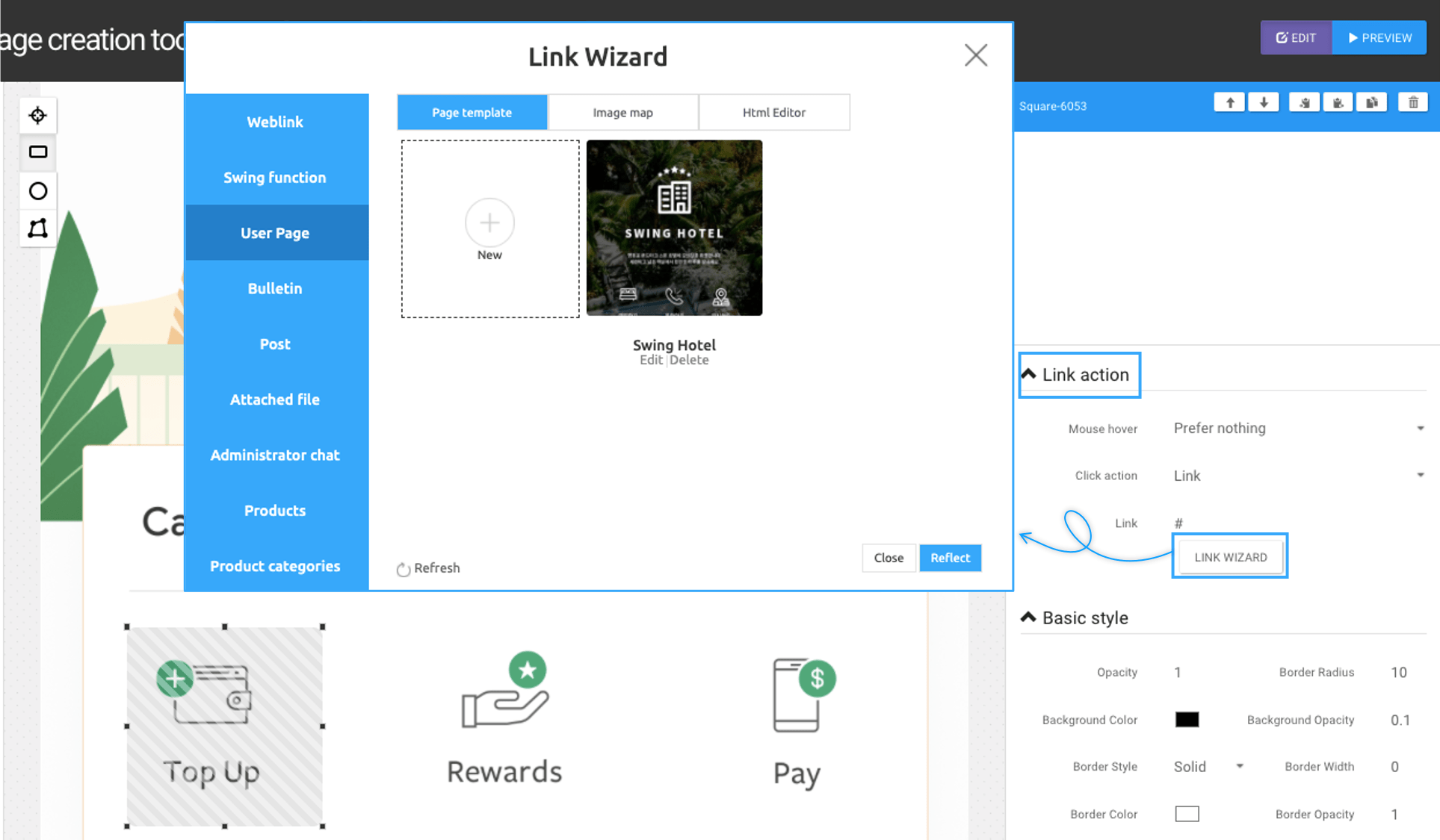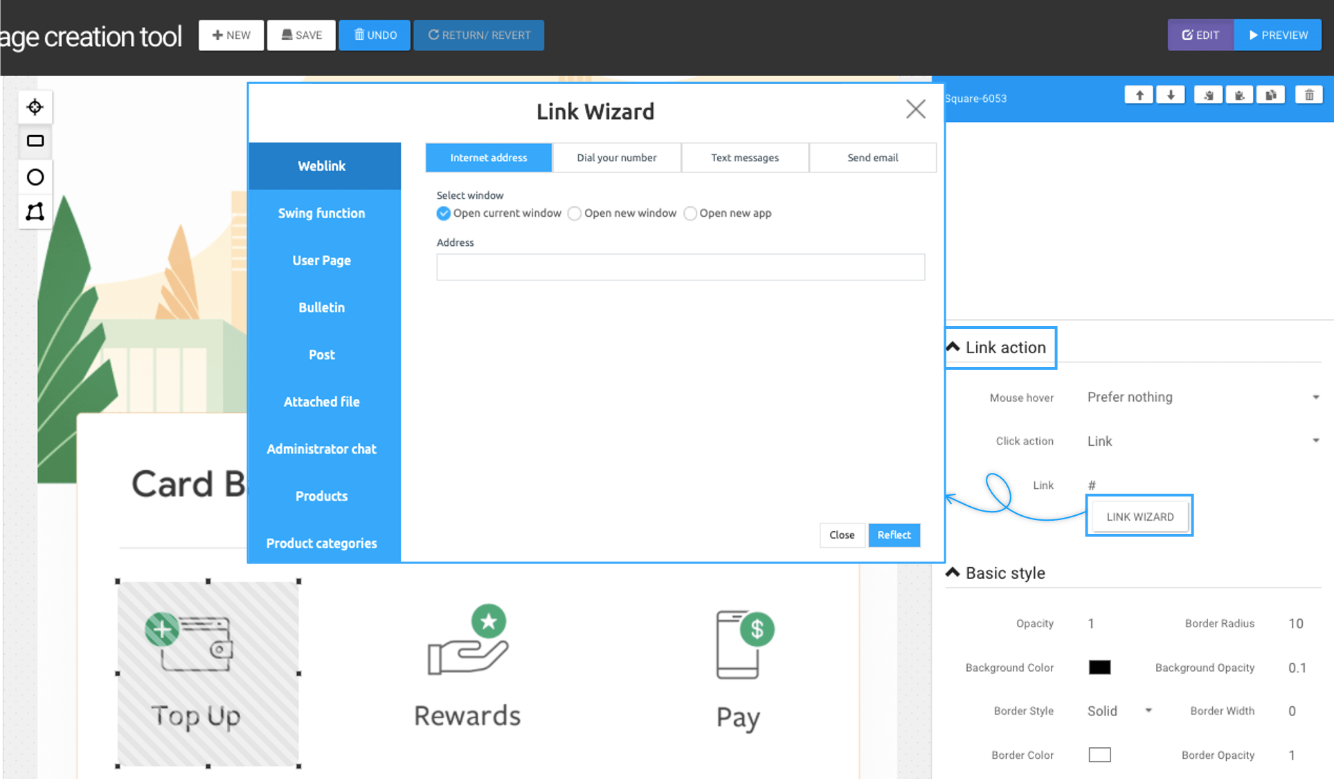 3) Link Wizard: A tool that allows you to select pages such as app menus and web links.
