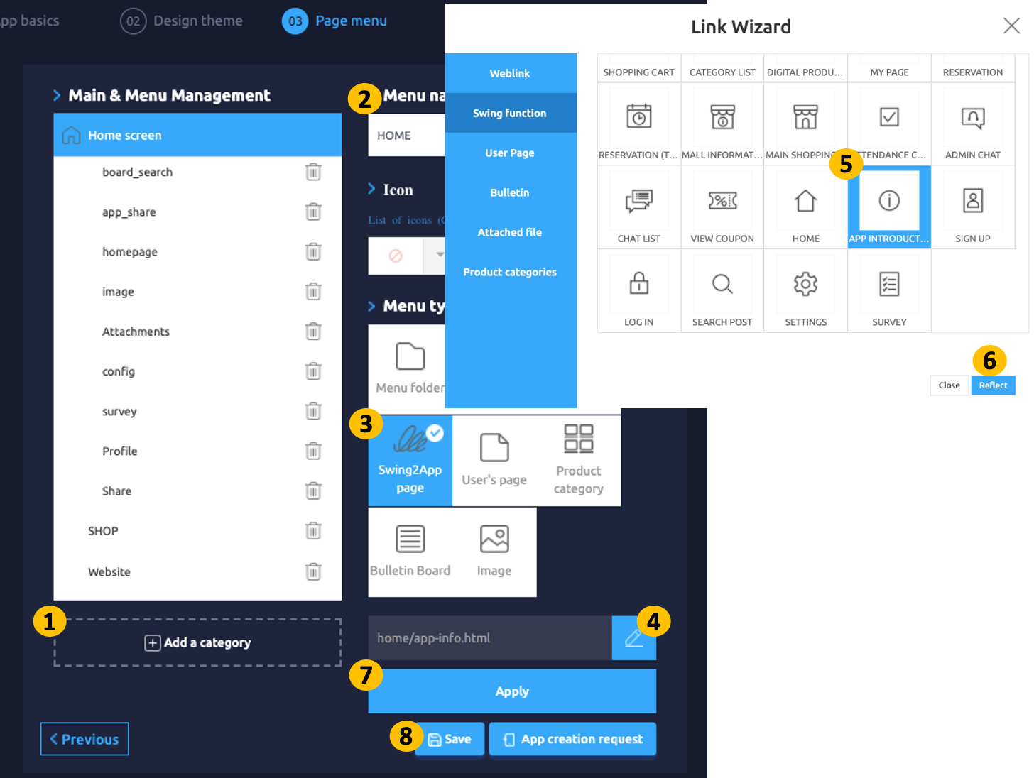 5) Select and apply the [App Introduction] menu from the swing2app page menu.