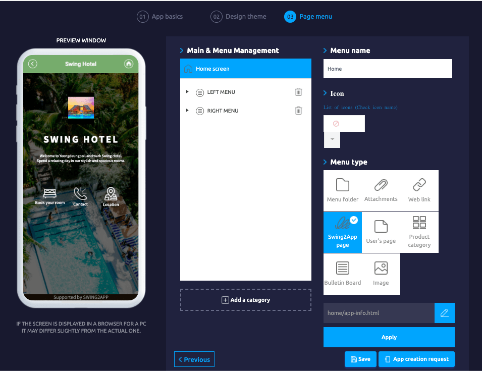 During the page menu step, create the main home screen, categories, and menus for your app.