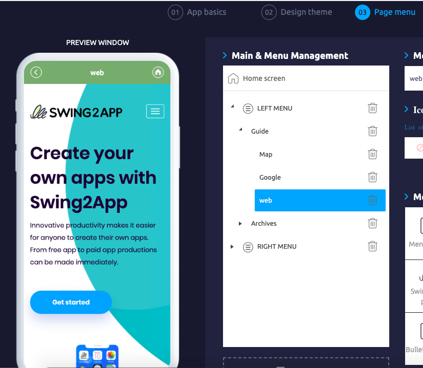 Page menus are the most important step in app production, and you can apply the main home screen and menus that create your app.