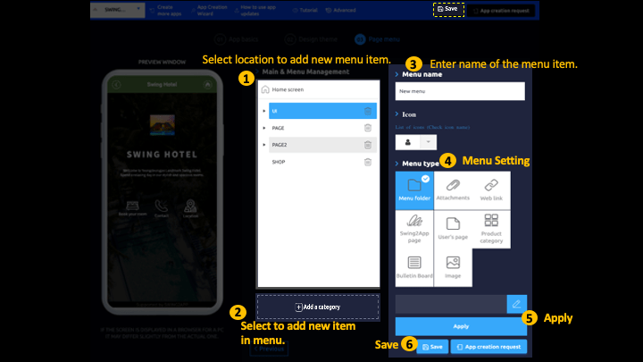 * Menu type: We offer a variety of menus, such as swing2app pages, user pages, and bulletin boards.