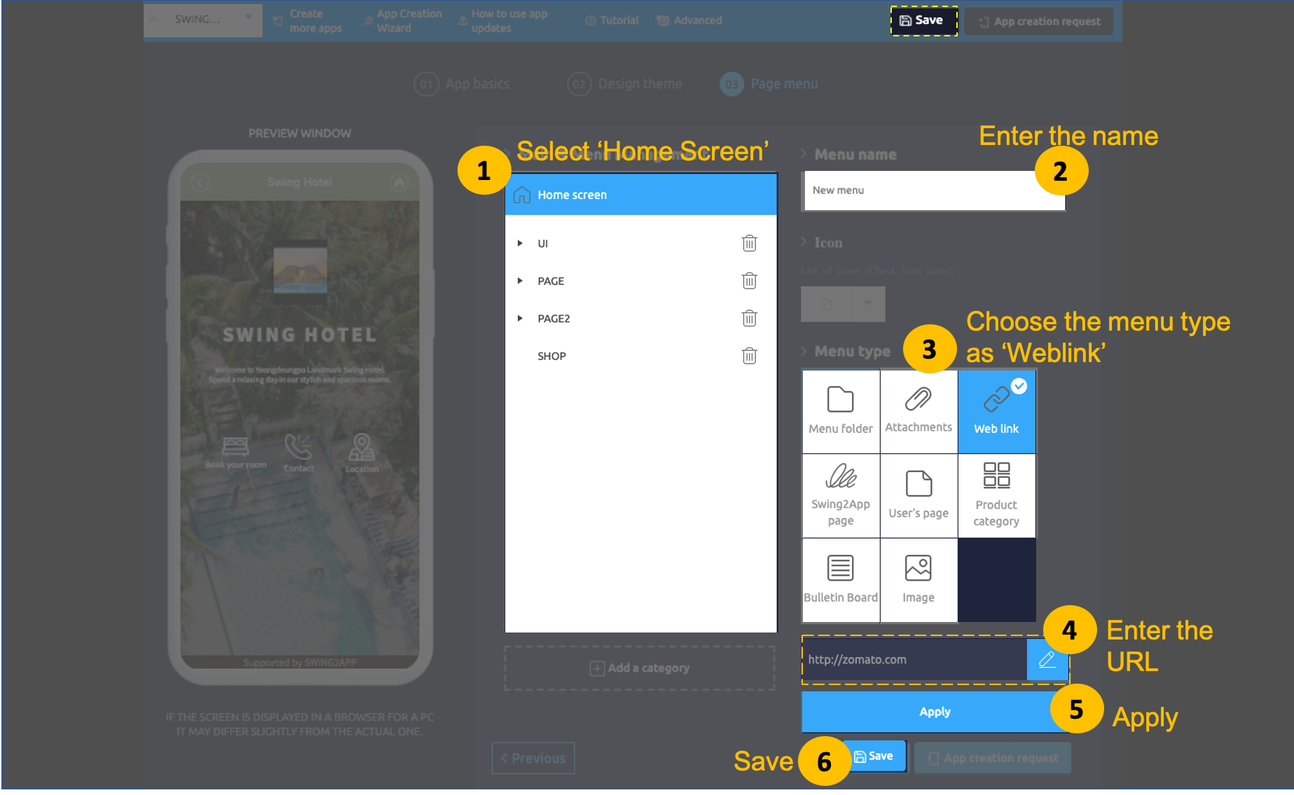 3) Select the Web link menu in the menu settings. (Swing2App homepage URL: https://support.swing2app.com)