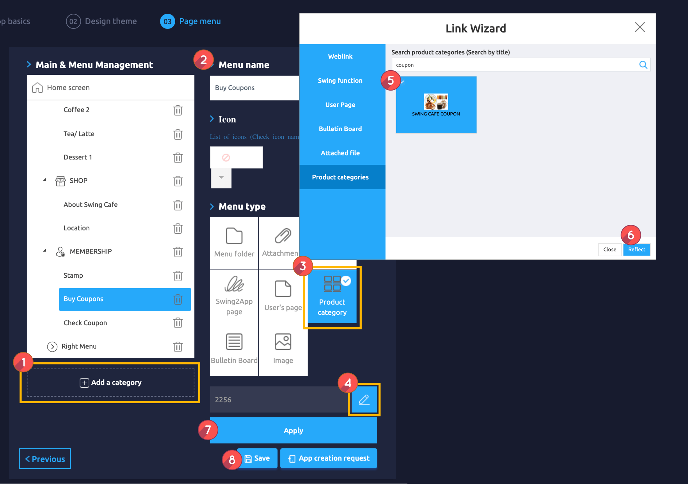 1. From the menu set by default, click the Add a category to add a new menu. 2. Edit the name of the added item in Menu Name. 3. Select Product Category in the Menu Type. You do not need to change the menu name. *Important* Since the category name appears as the menu name, even if you enter the name, it is not reflected as the menu name. 4. Click on Link Wizard(pencil icon). 5. Search the name in search box in Product Category in the Link Wizard window. * Category must be created in advance when registering Swing Shop products. Not applicable if there is no product category 6. Click on Reflect. 7. Click on Apply and 8. Click Save.