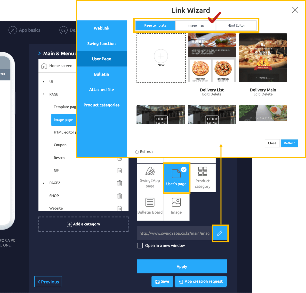 5) In the link wizard window, select the desired page from the user page-3 page creation tools and click the reflect button.