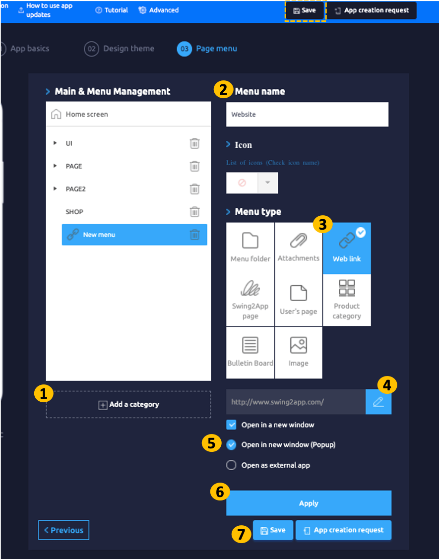 Move to the page menu step of the app production step. Click the Add New Category button on the Main Menu to add the menu.