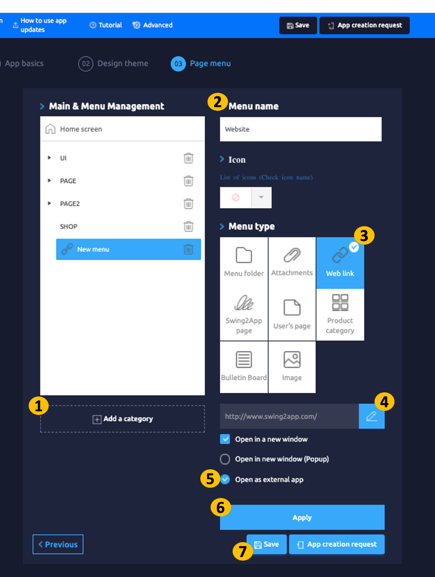 How to use web links, as well as their options. [Open in new window], [Open as external app] function will also be announced. We’ll show you how to use the [web link] menu in the page menu step.