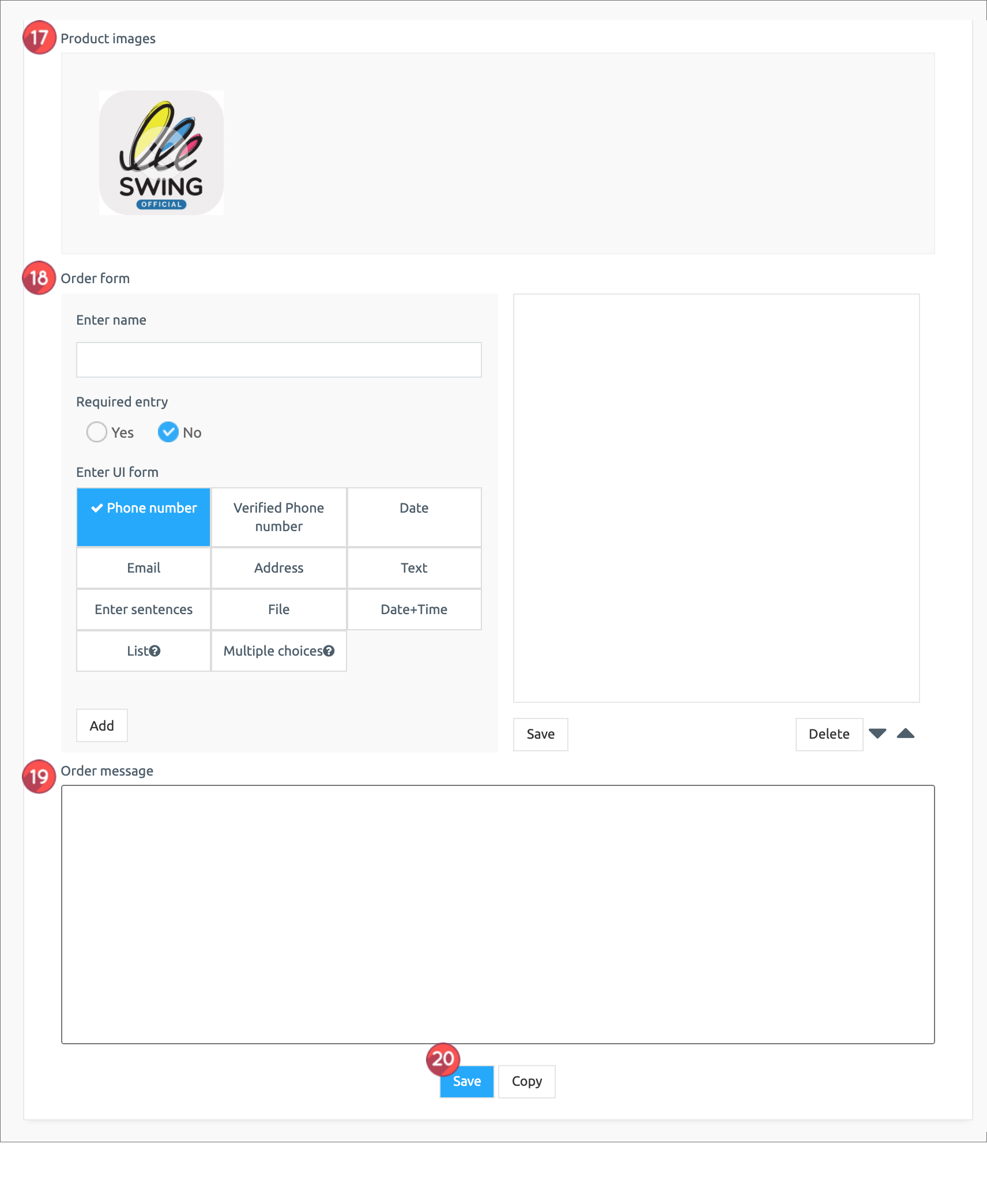 17. Product detailed image: Register the product image. Multiple images can be registered and can be reordered.