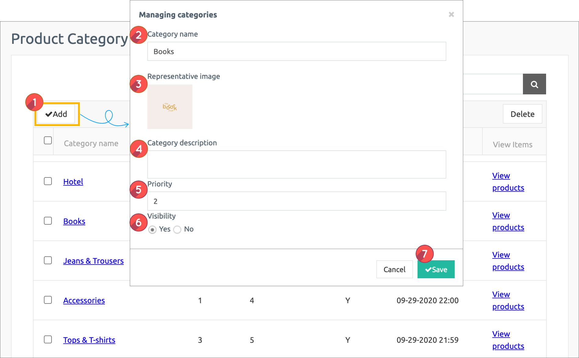In the category management window, 2) Category name 2) Representative image 3) Category description 5) Priority 6) Check display status 7) Select save button.
