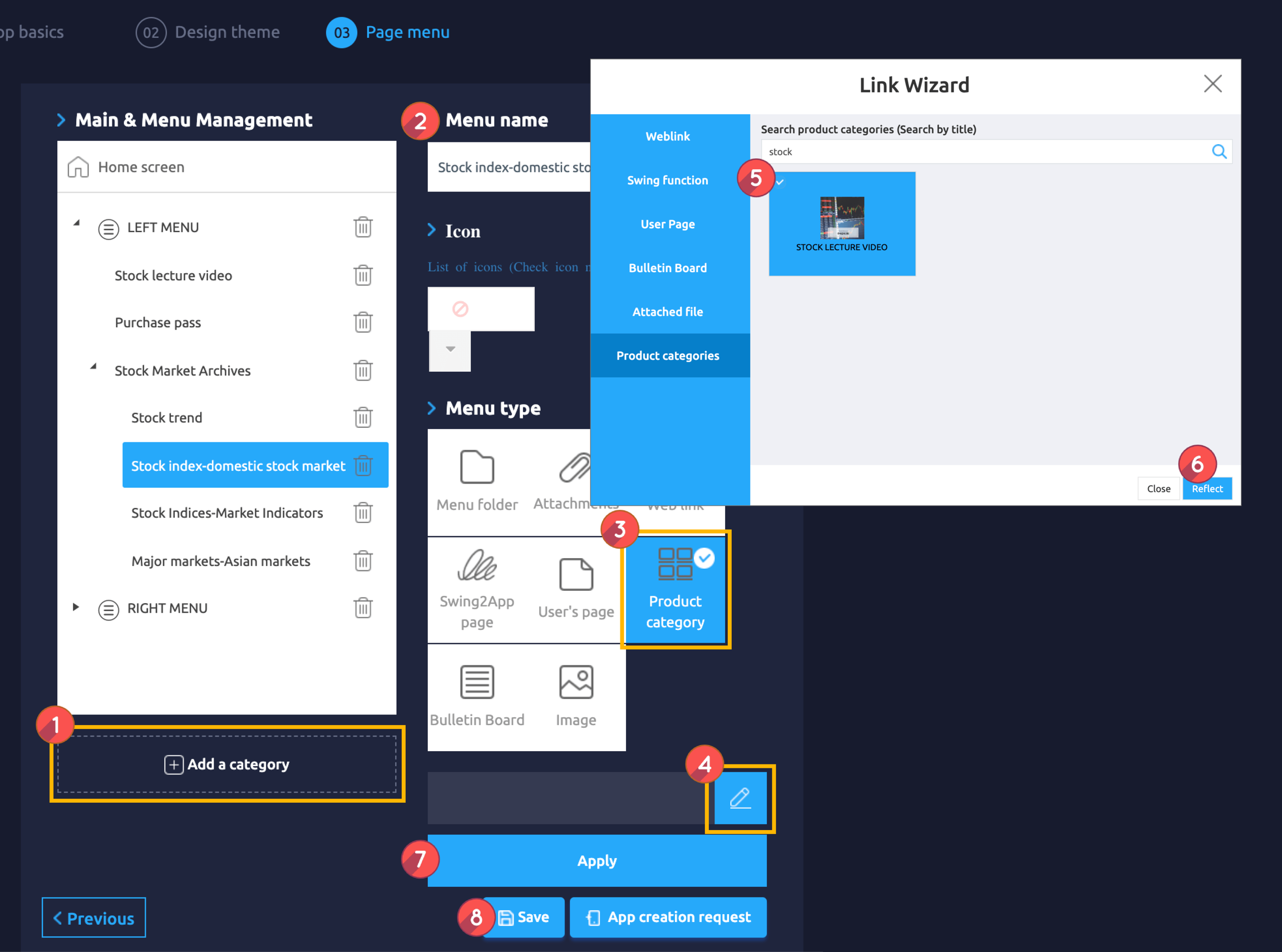 Move to the page menu step of the app production step. Click the Add New Category button on the Main Menu to add the menu.\