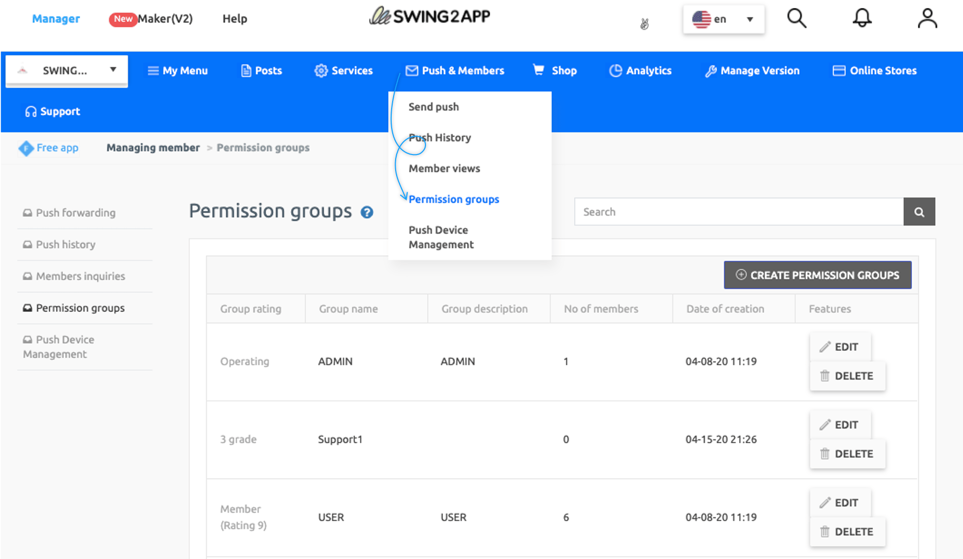 Move to the swing2app operation page → push & member menu → [Permission group setting] menu.