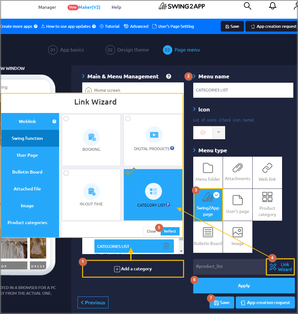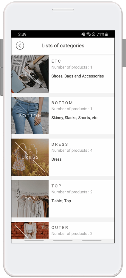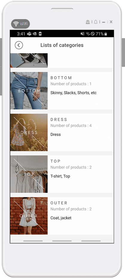 We will inform you how to apply the ‘Category List’ among the pages provided by Swing Shop to the app.