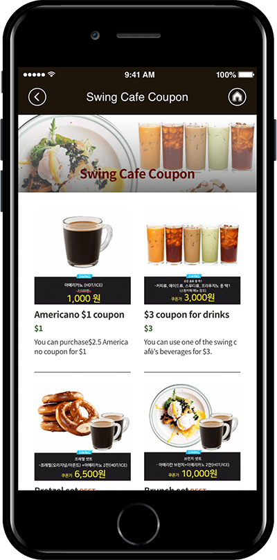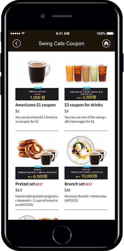 **When applying the “Swing Cafe Coupons” category to the app, a list of categories will be displayed and you can see the products listed in that category.**