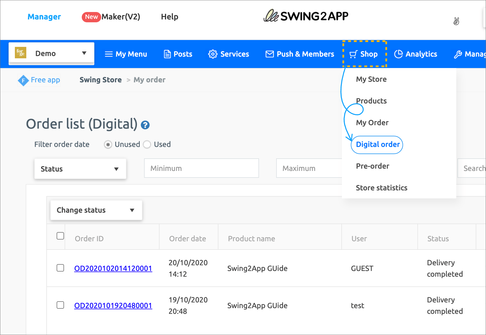2) The menu is only available to users who have applied for the Swing Store(Swing2App Shopping Mall) service.