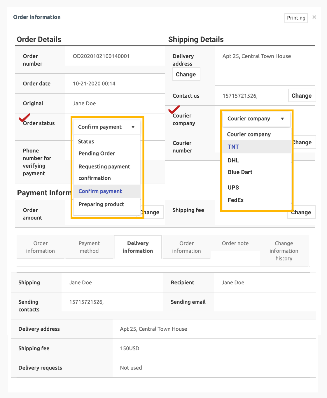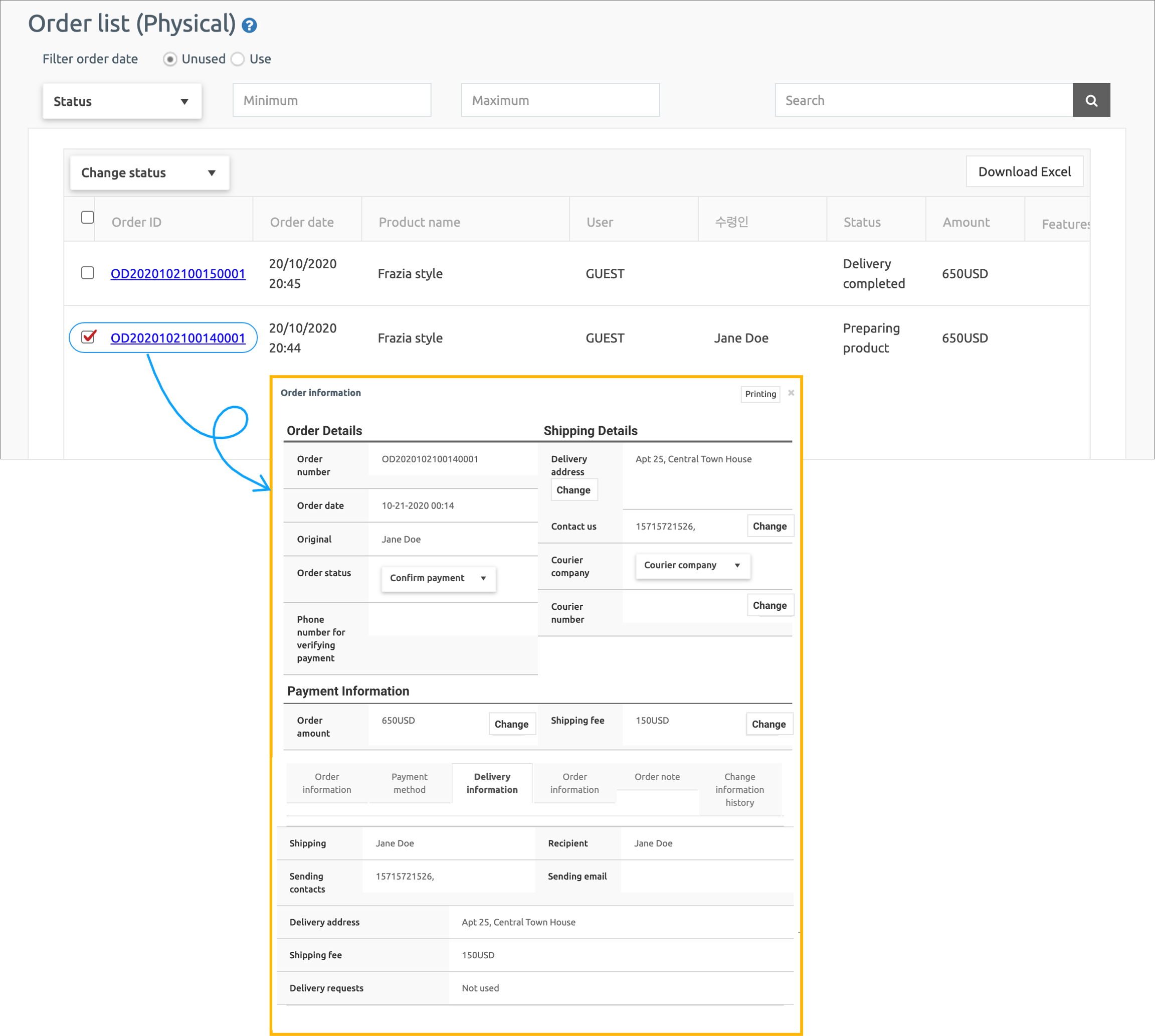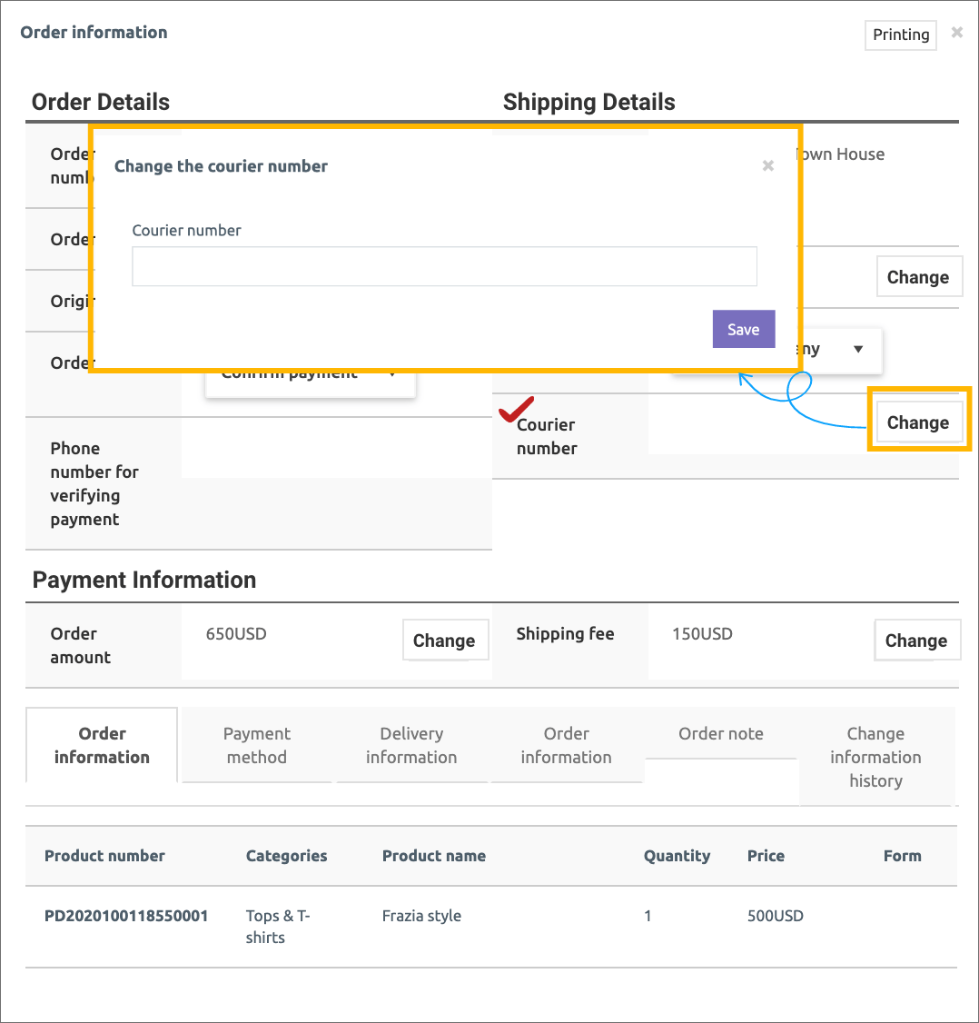 On the physical product order management page, the administrator can manage the order status, change the shipping address, and the courier company.
