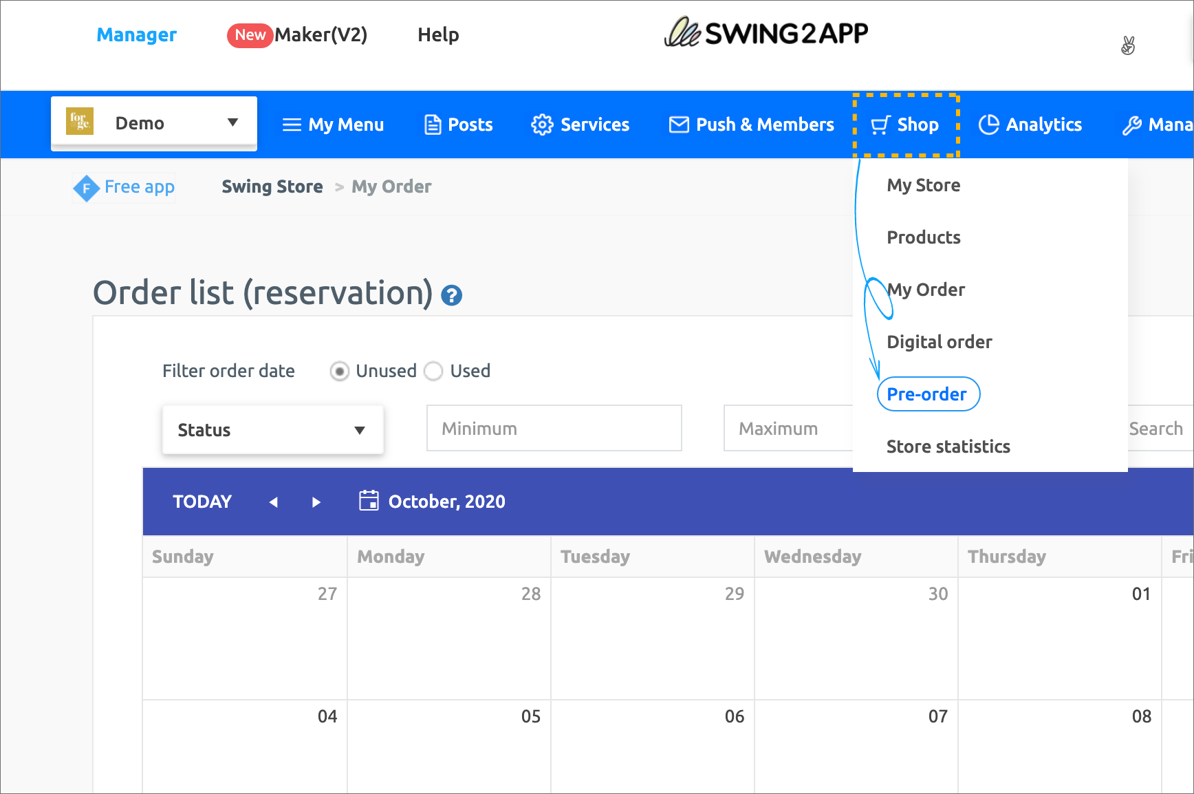 If you are selling app creation reservation system products, go to the Manager → Shop → [Pre-order] page.