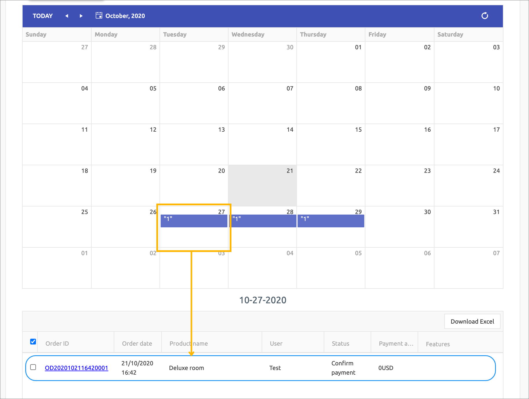 If there are items scheduled on that date, the calendar will be marked with a blue line, along with the number of bookings.