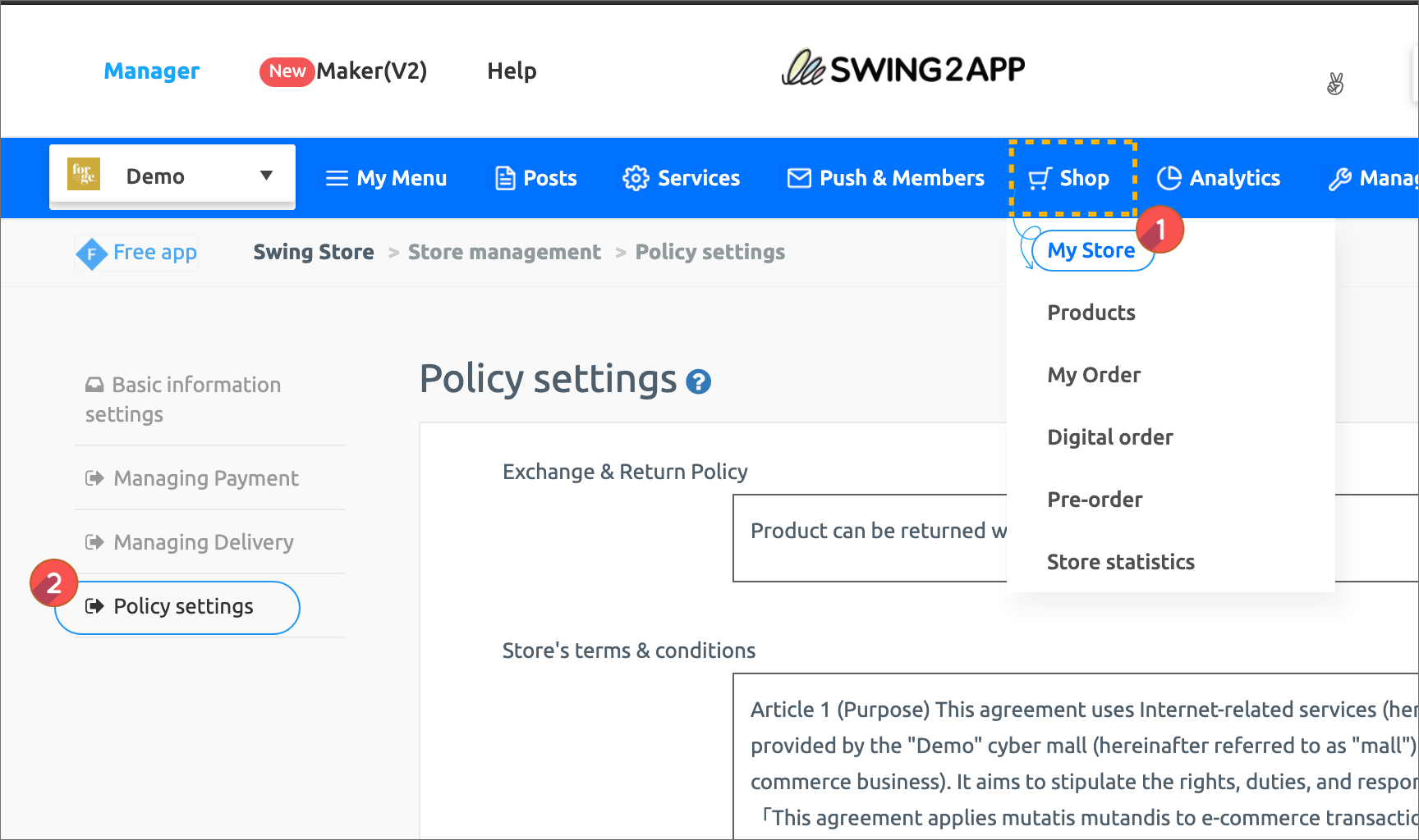 *Swing2App has set the basic policy contents of the shopping mall, so please edit the contents.