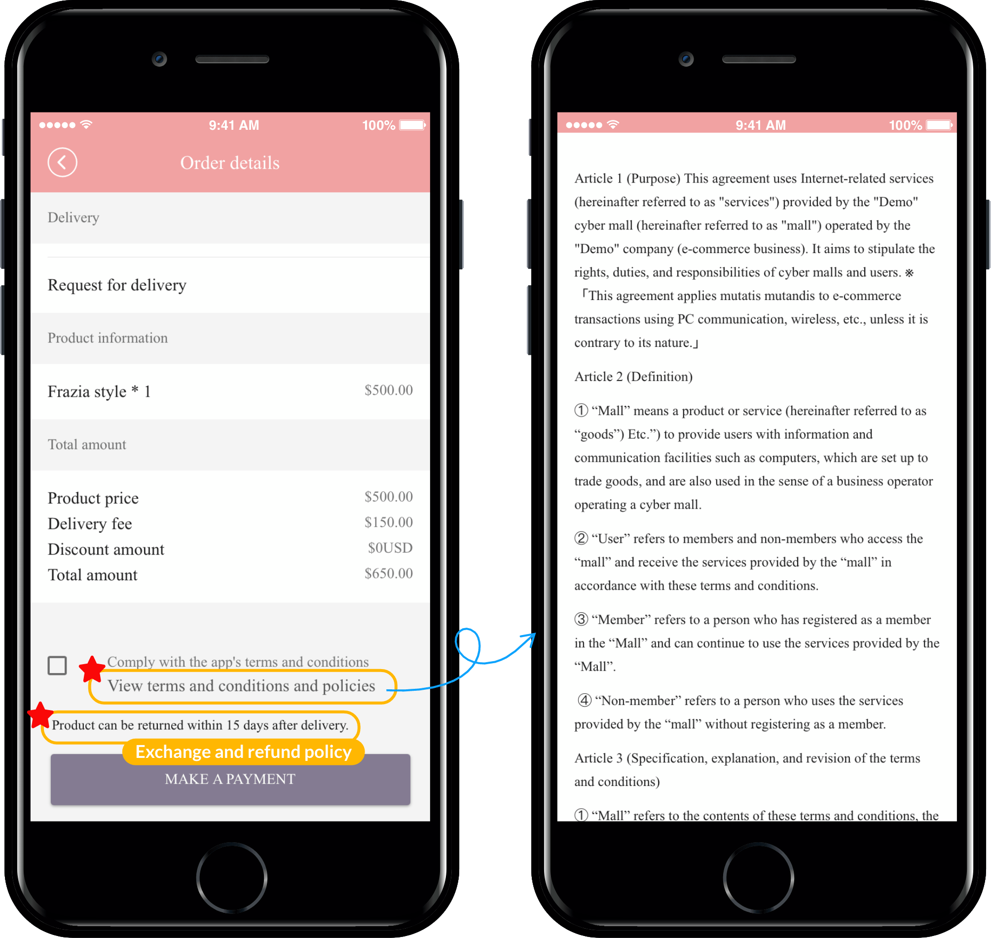 *Exchange and return, shopping mall terms and conditions policy, are provided by default setting in the swing2app.