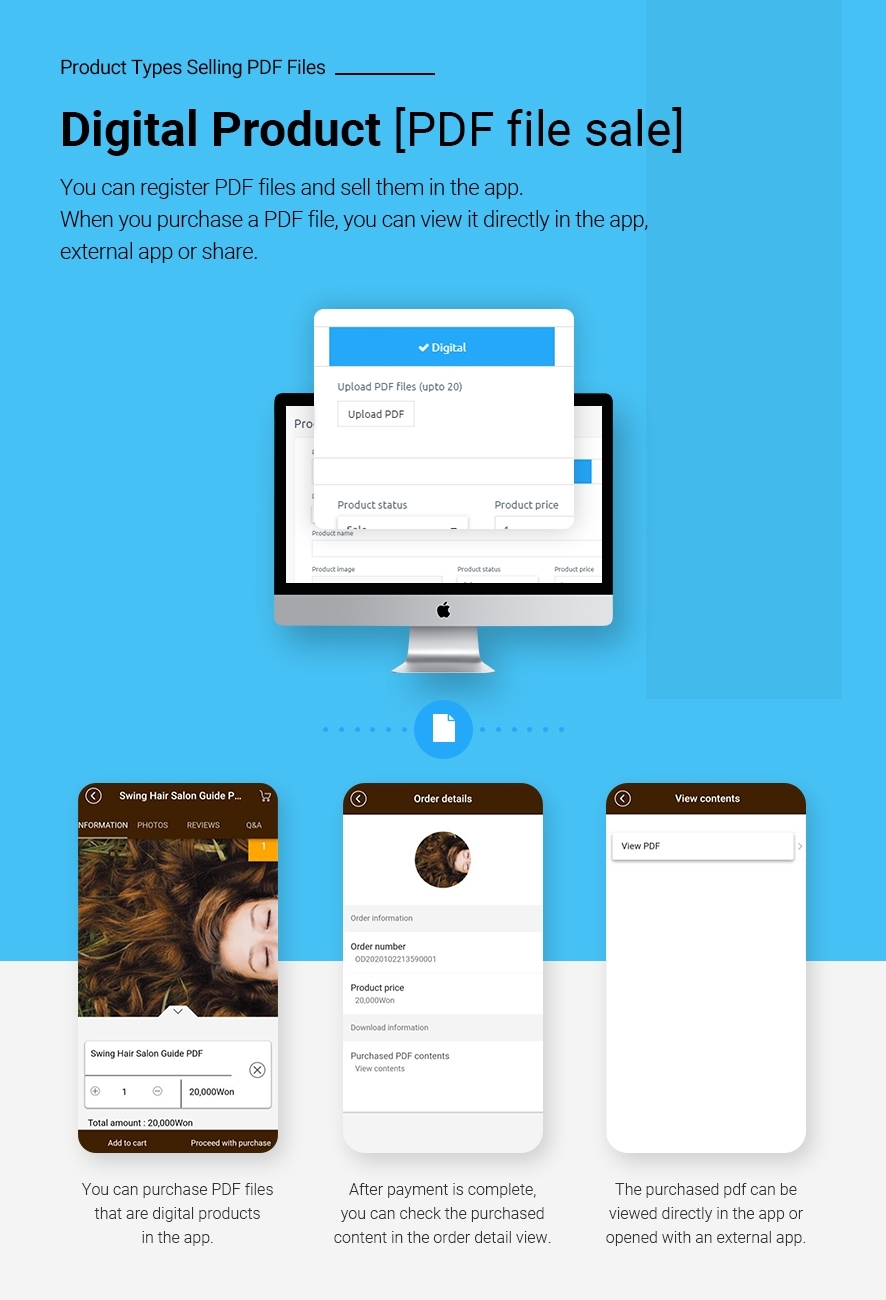 Digital Products – Upload and sell PDF files. If you purchase PDF files, you can check them directly in the app, and you can check them through external apps or sharing. You can check the PDF file you purchased on My Page.