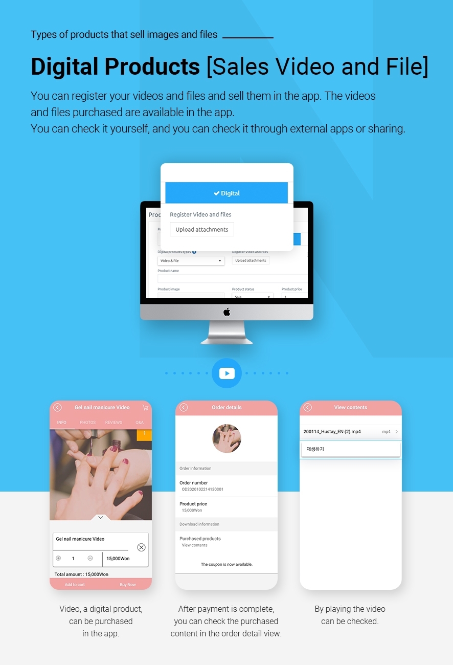 You can attach video and document files and sell them in the app. You can check the videos and files you purchased directly from the app, and you can check them through an external app or by sharing. You can check the videos and files you purchased on My Page.