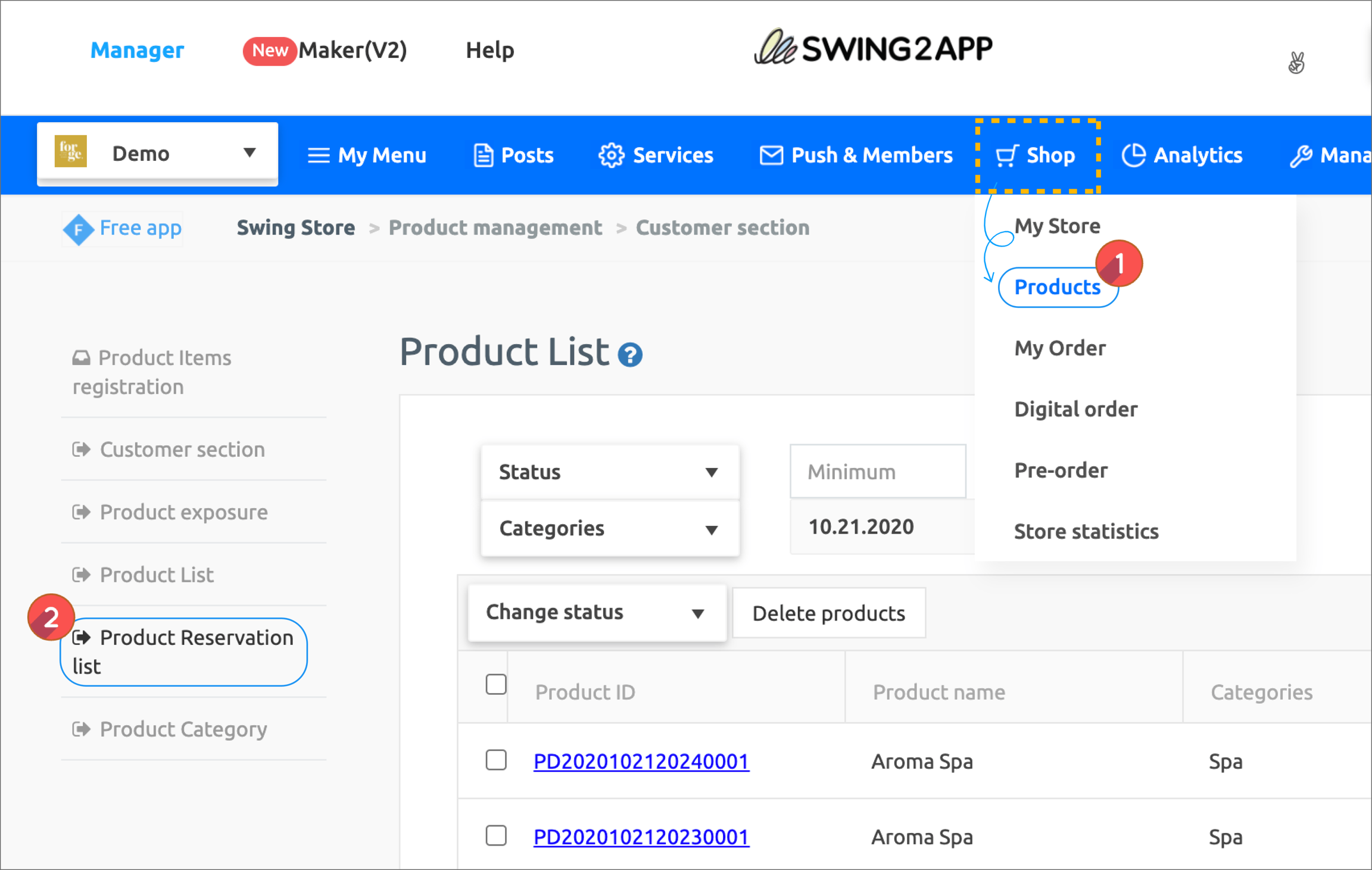 How to use the [Product List], [Reserved Product Inquiry] menu in Swing Store Product Management.