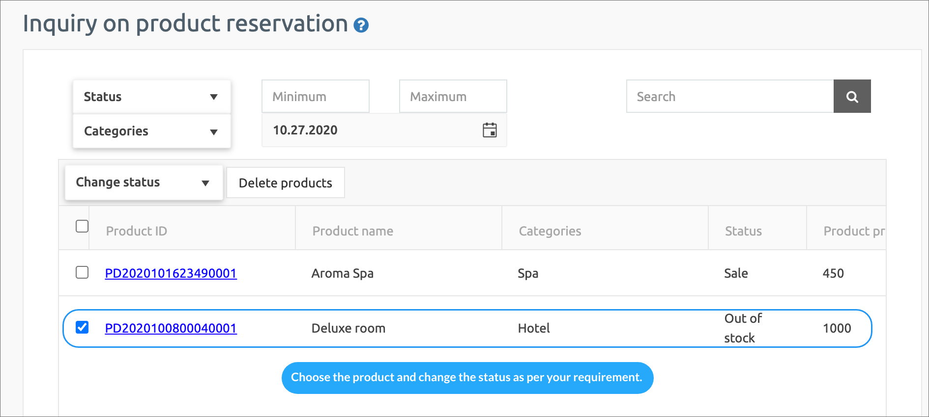 The product inquiry and the reservation product inquiry menu are all pages where you can check all the list of products registered in the product registration menu.